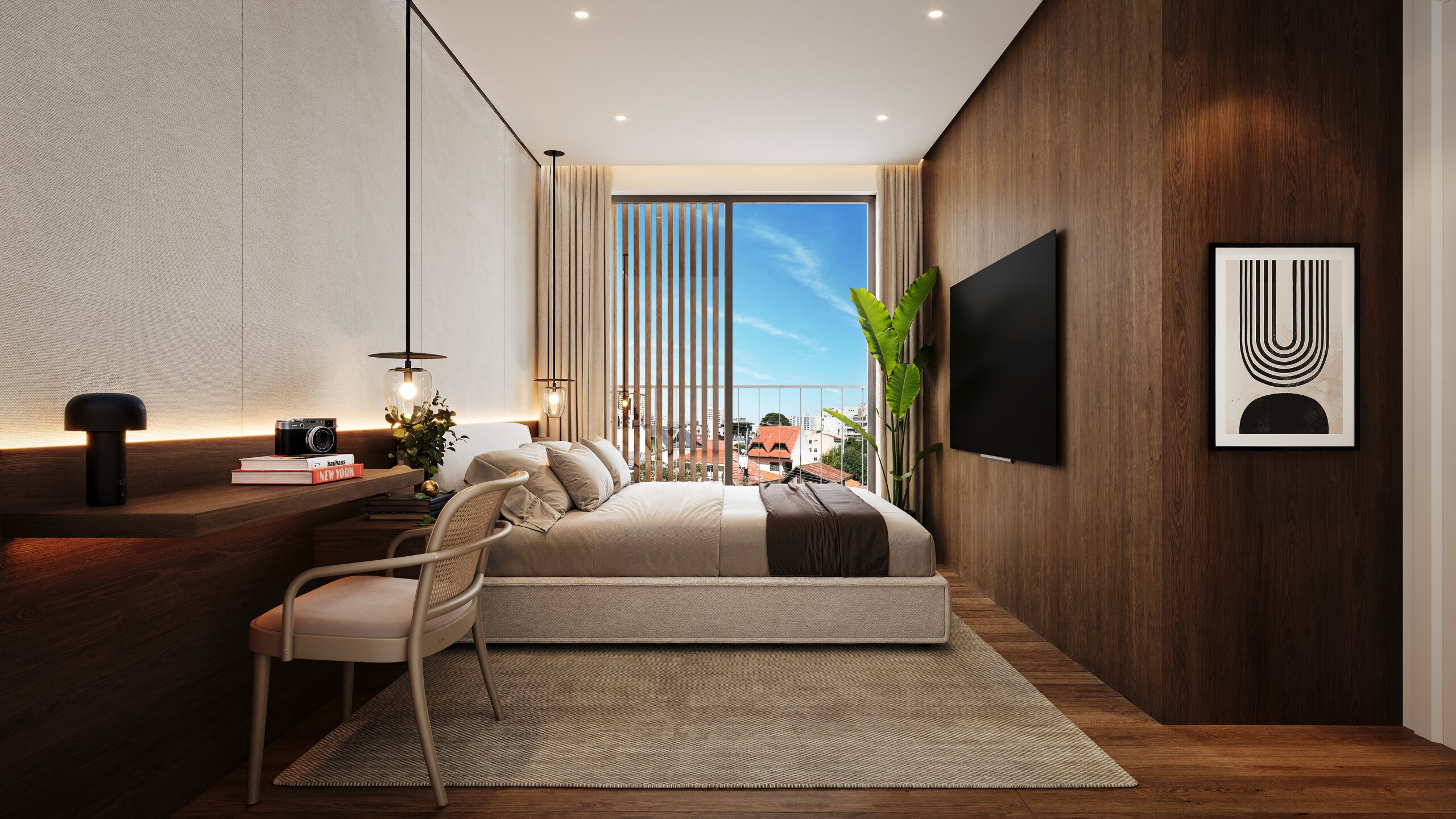 Entre os acabamentos e diferenciais: piso aquecido nos banheiros, bancadas em quartzo, esquadrias amplas com brises, churrasqueira a carvão, fechadura digital e 2 vagas de garagem com ponto de recarga para carro elétrico.