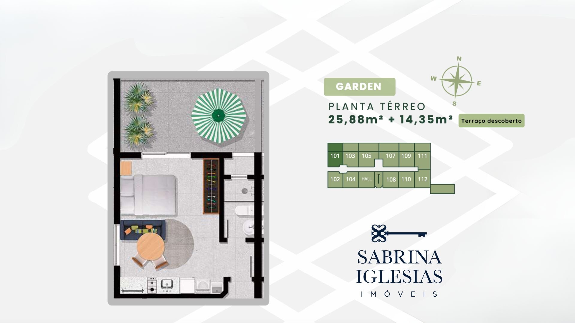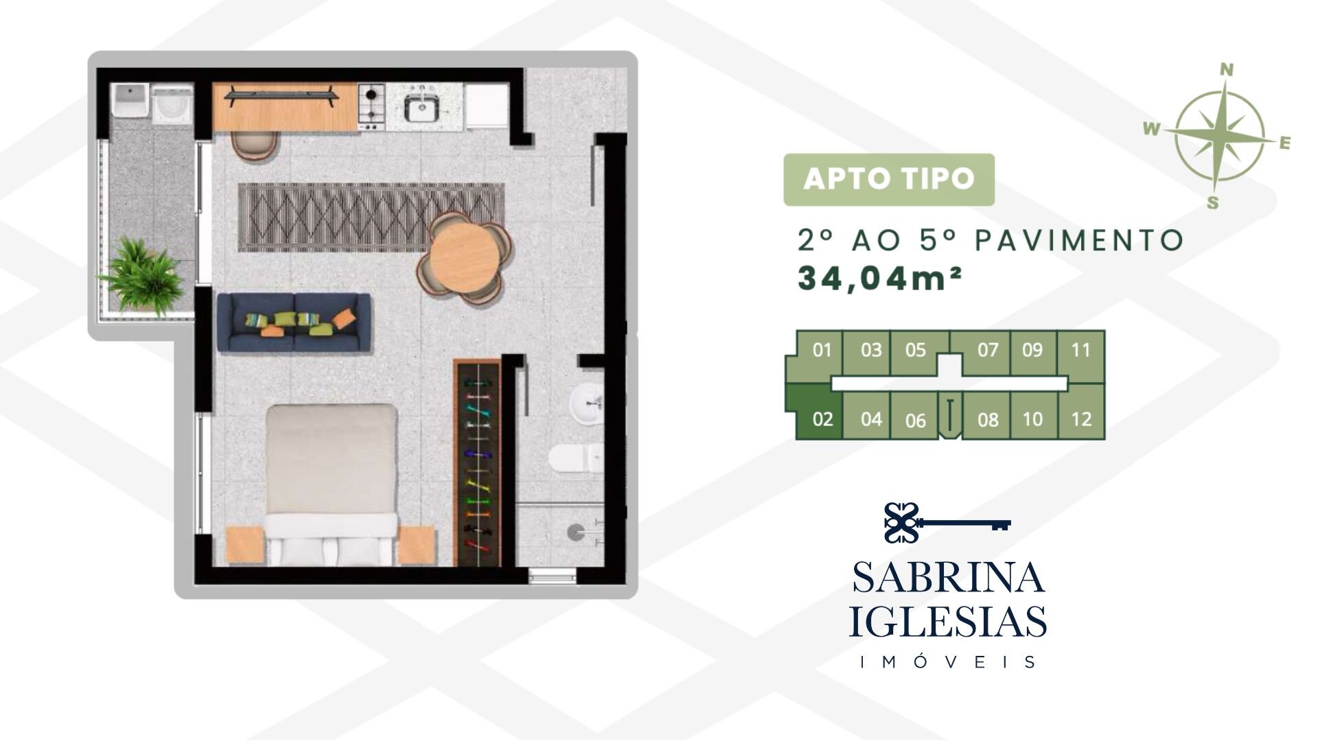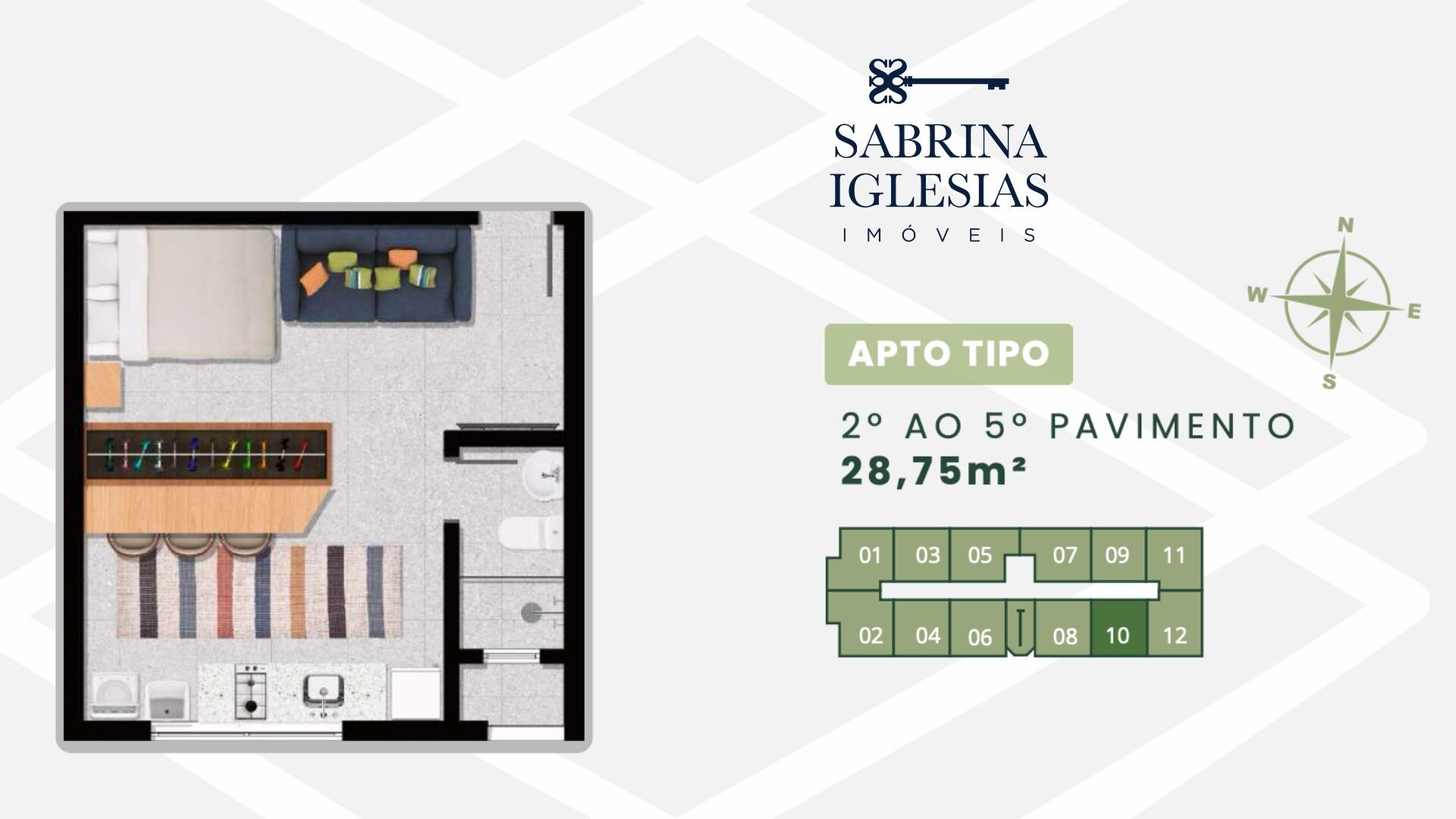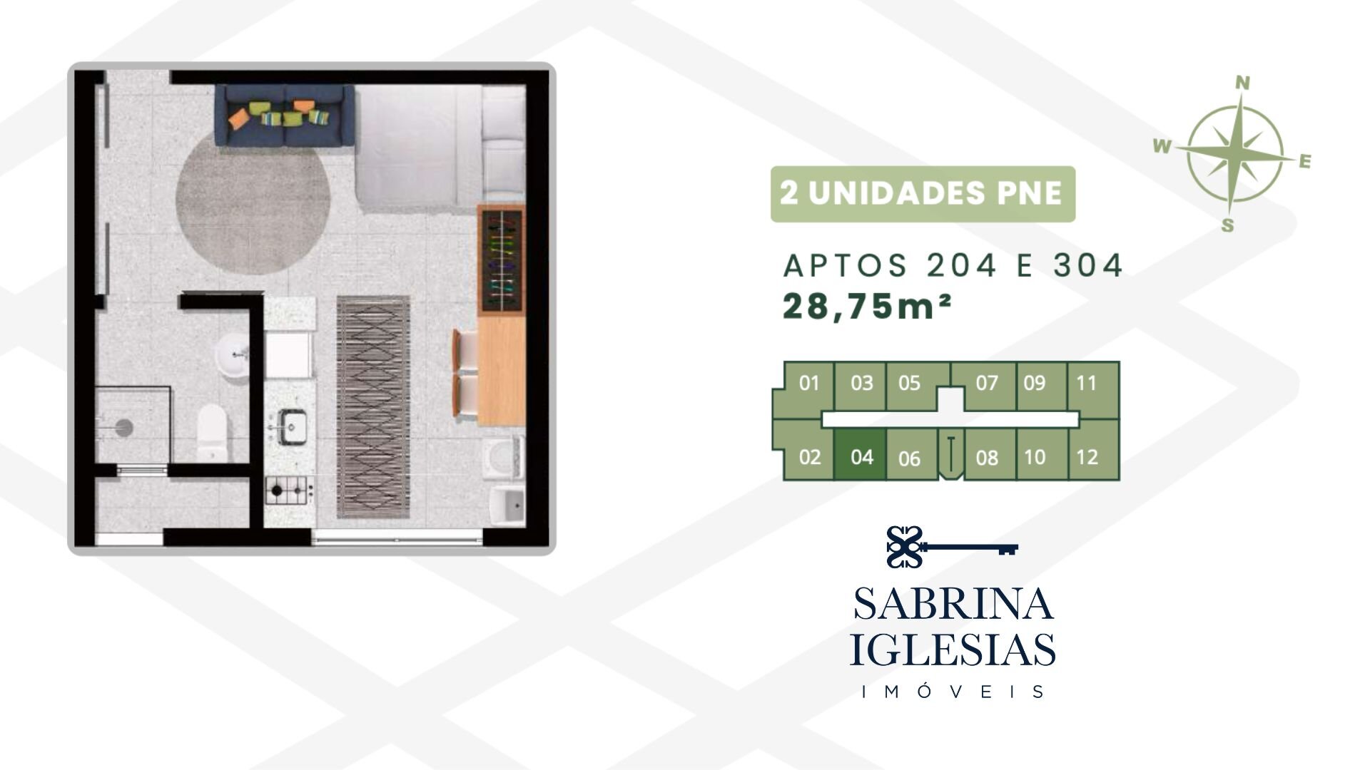 Studios tipo, de 27 m² a 34 m² – incluindo 3 unidades PNE com vaga vinculada;