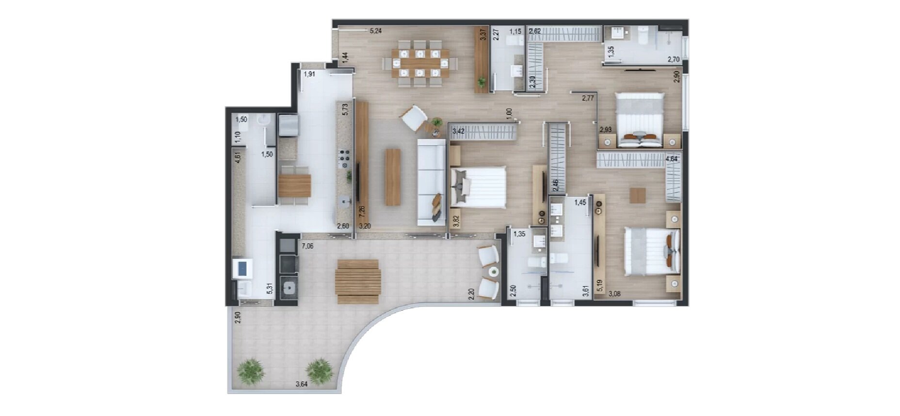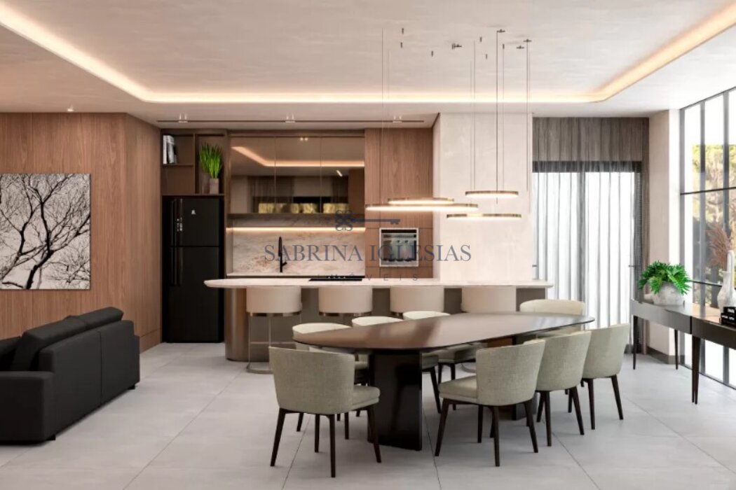 São três suítes bem distribuídas, cinco banheiros e duas vagas de garagem, em uma planta que valoriza tanto os espaços internos quanto a conexão com o exterior.