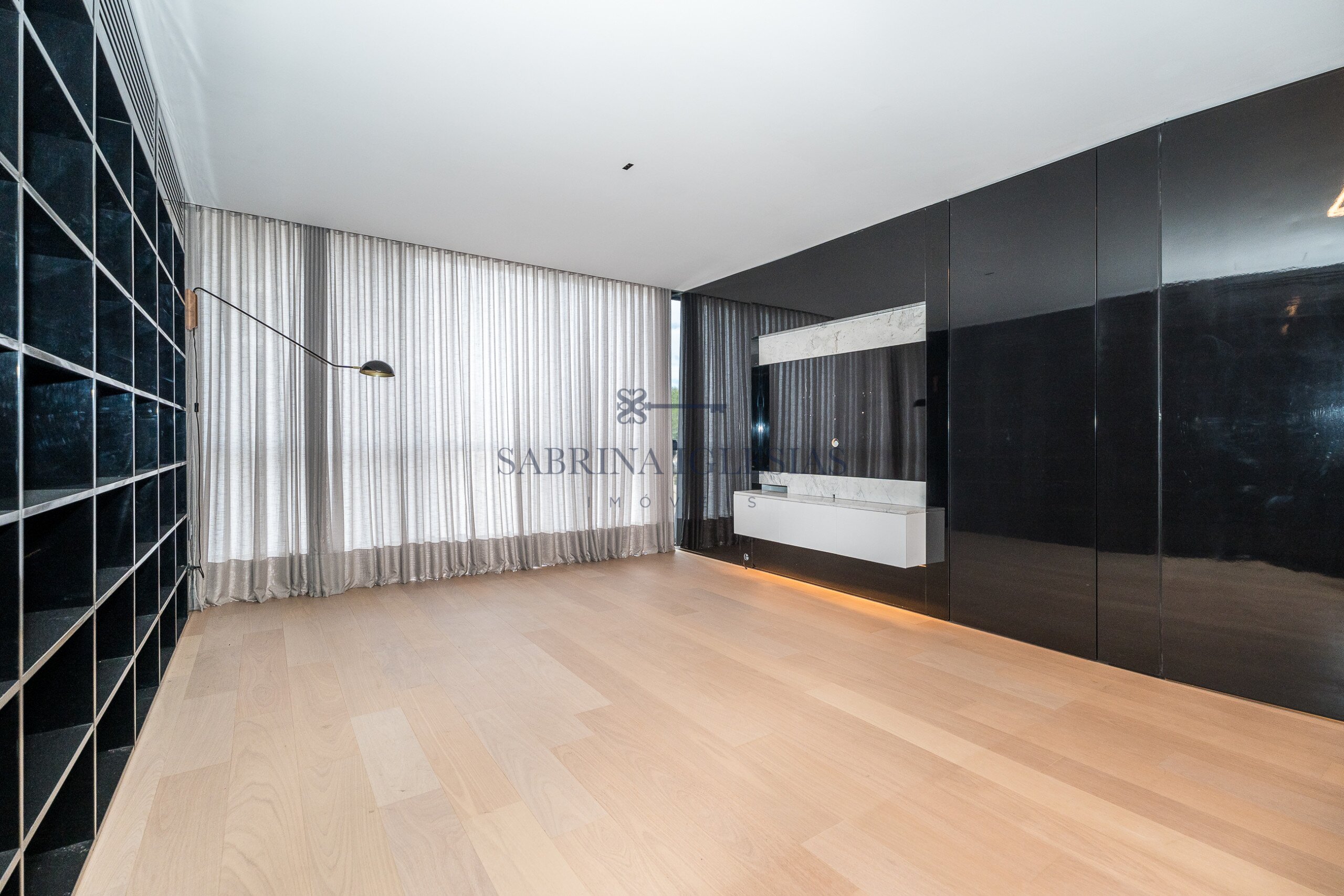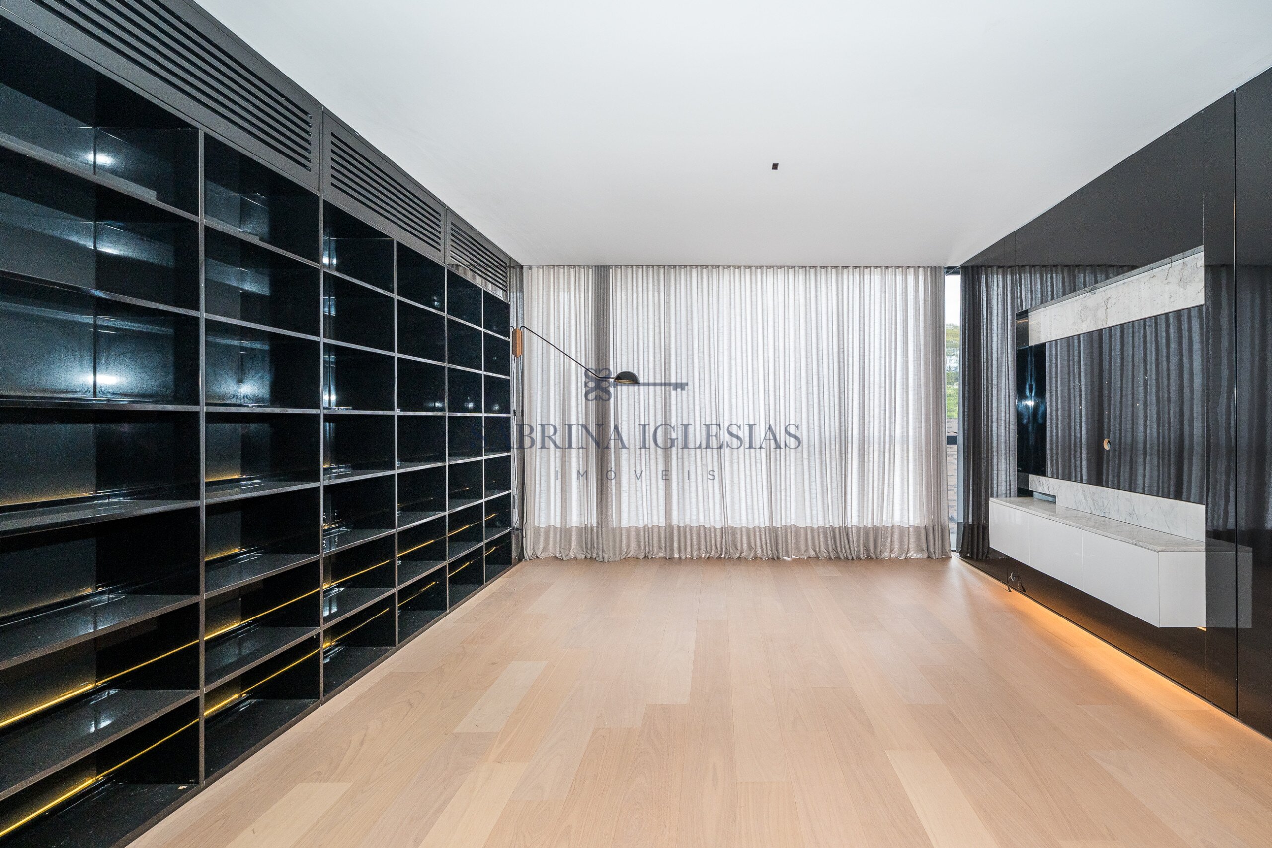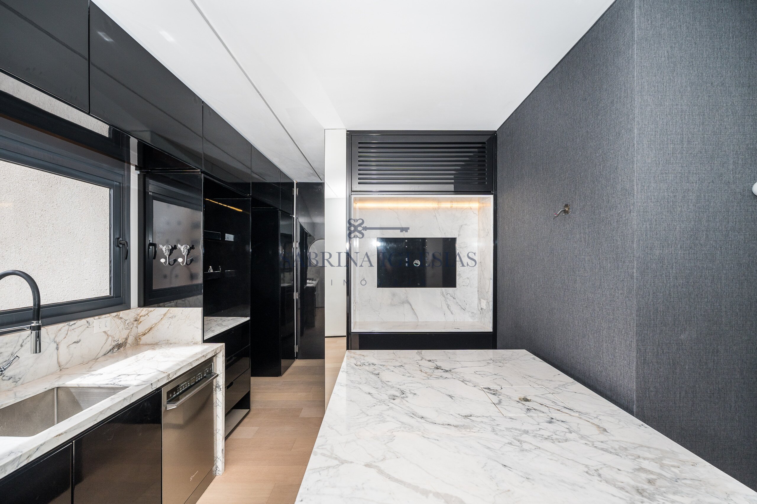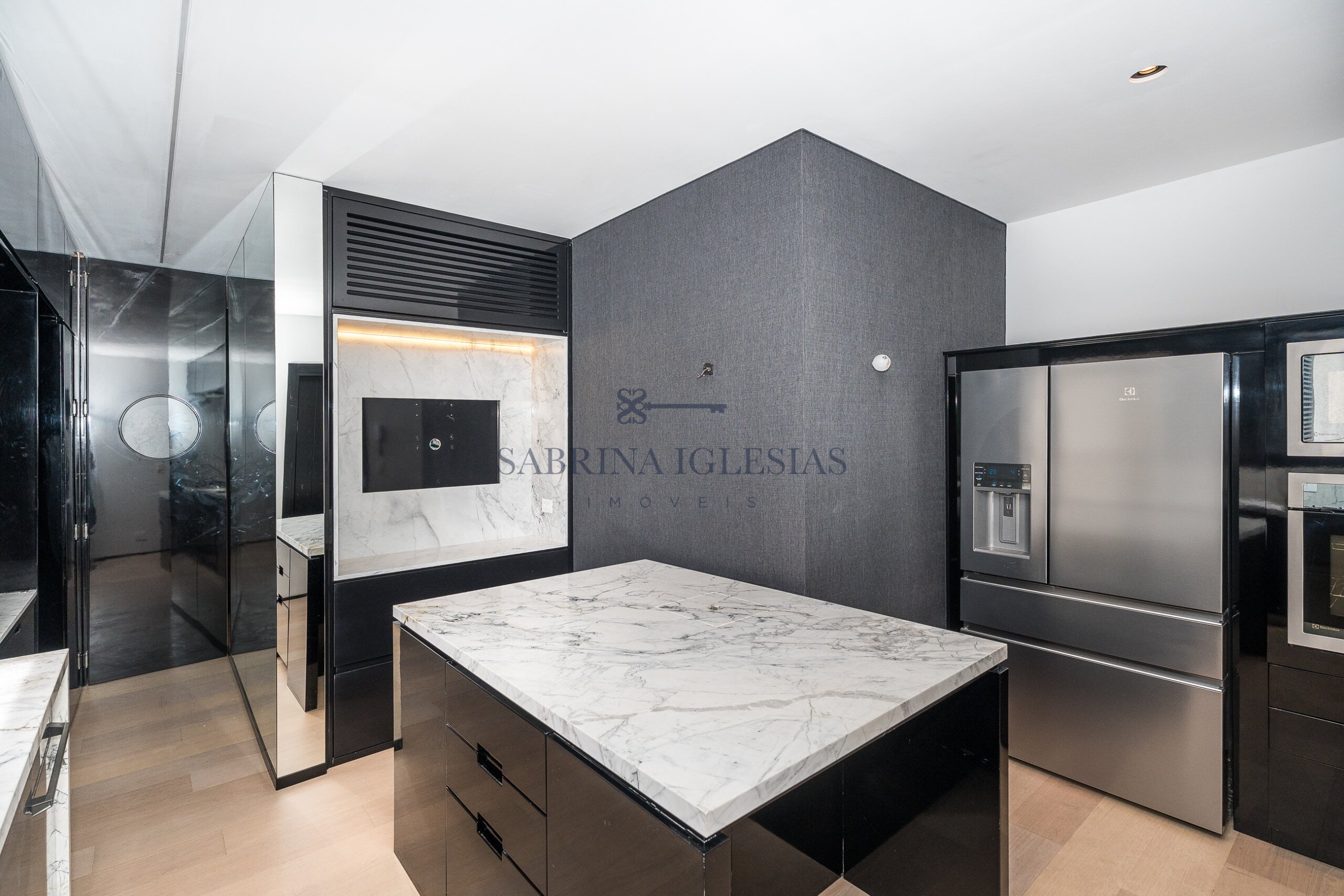 O elevador social (com senha) dá acesso ao espaço que integra o living, home theater, sala de jantar, espaço gourmet (com churrasqueira escondida), varanda e um piano de cauda já na entrada. A cozinha fechada conta com uma ilha para refeições rápidas e pode ser acessada pela sala e pela área de serviço, que se conecta a área íntima da casa.