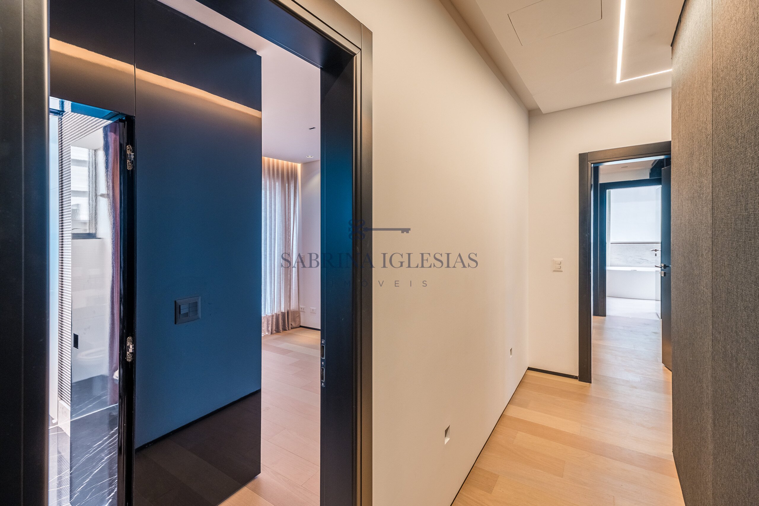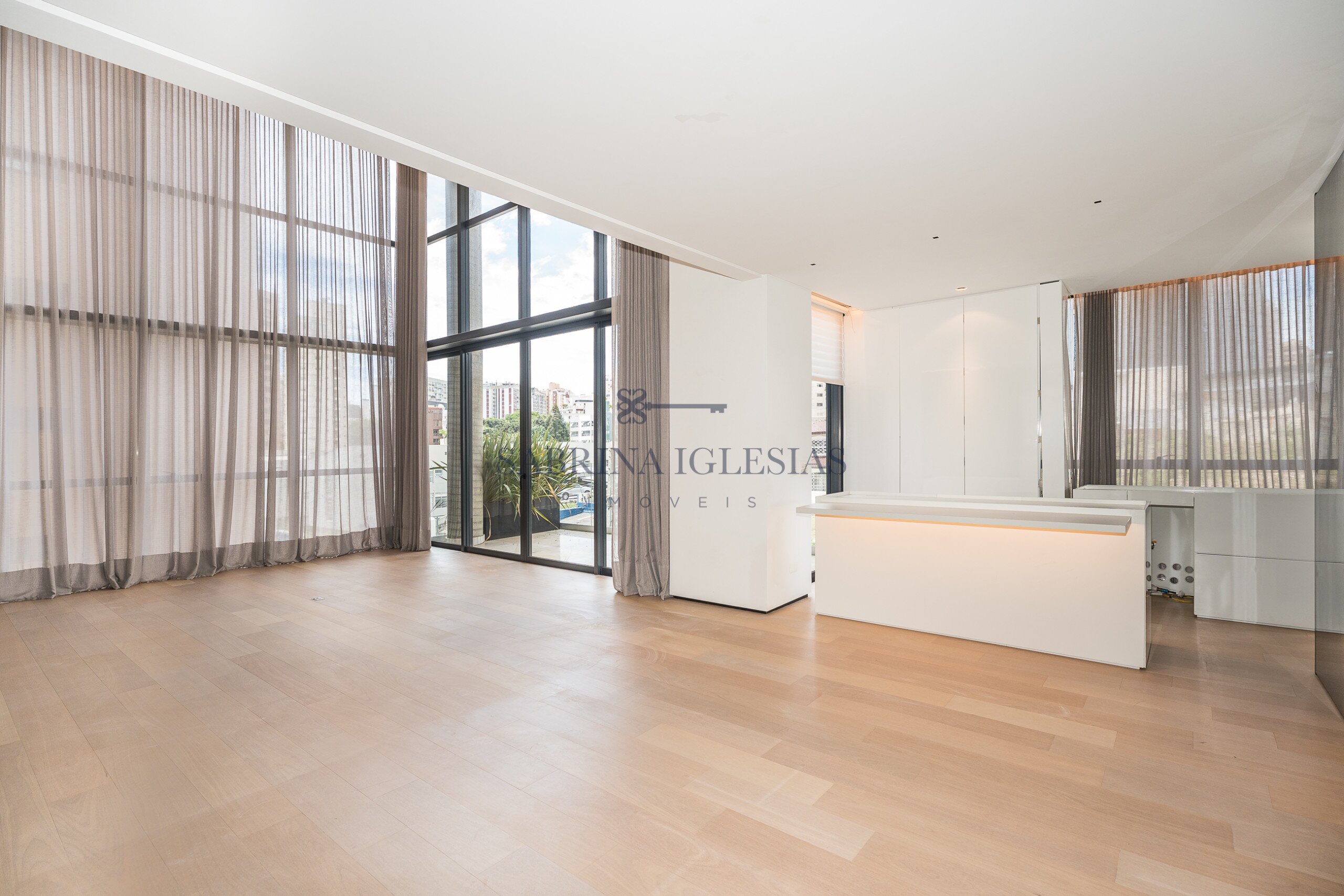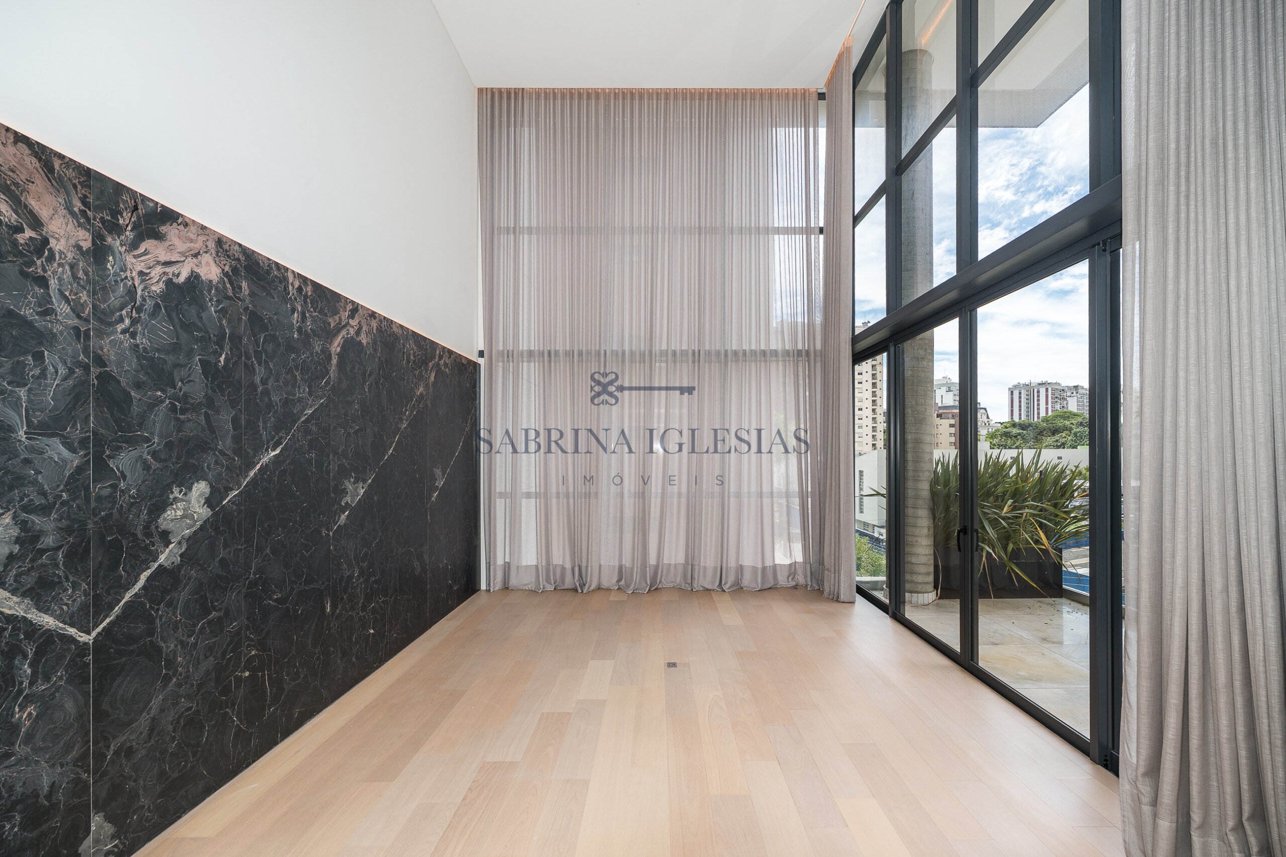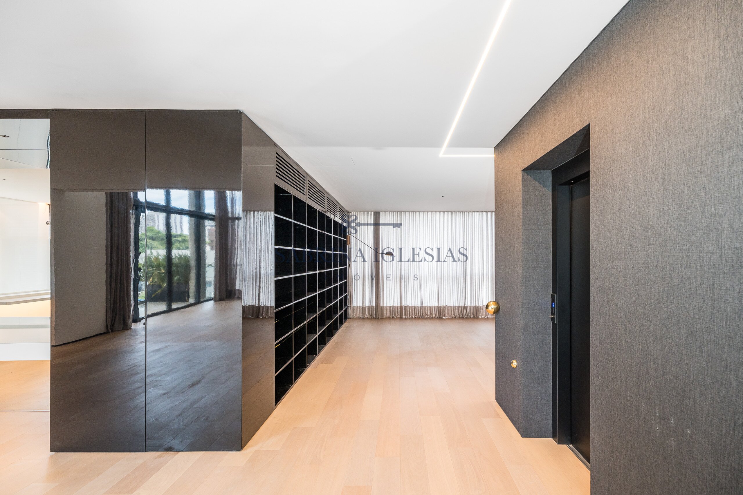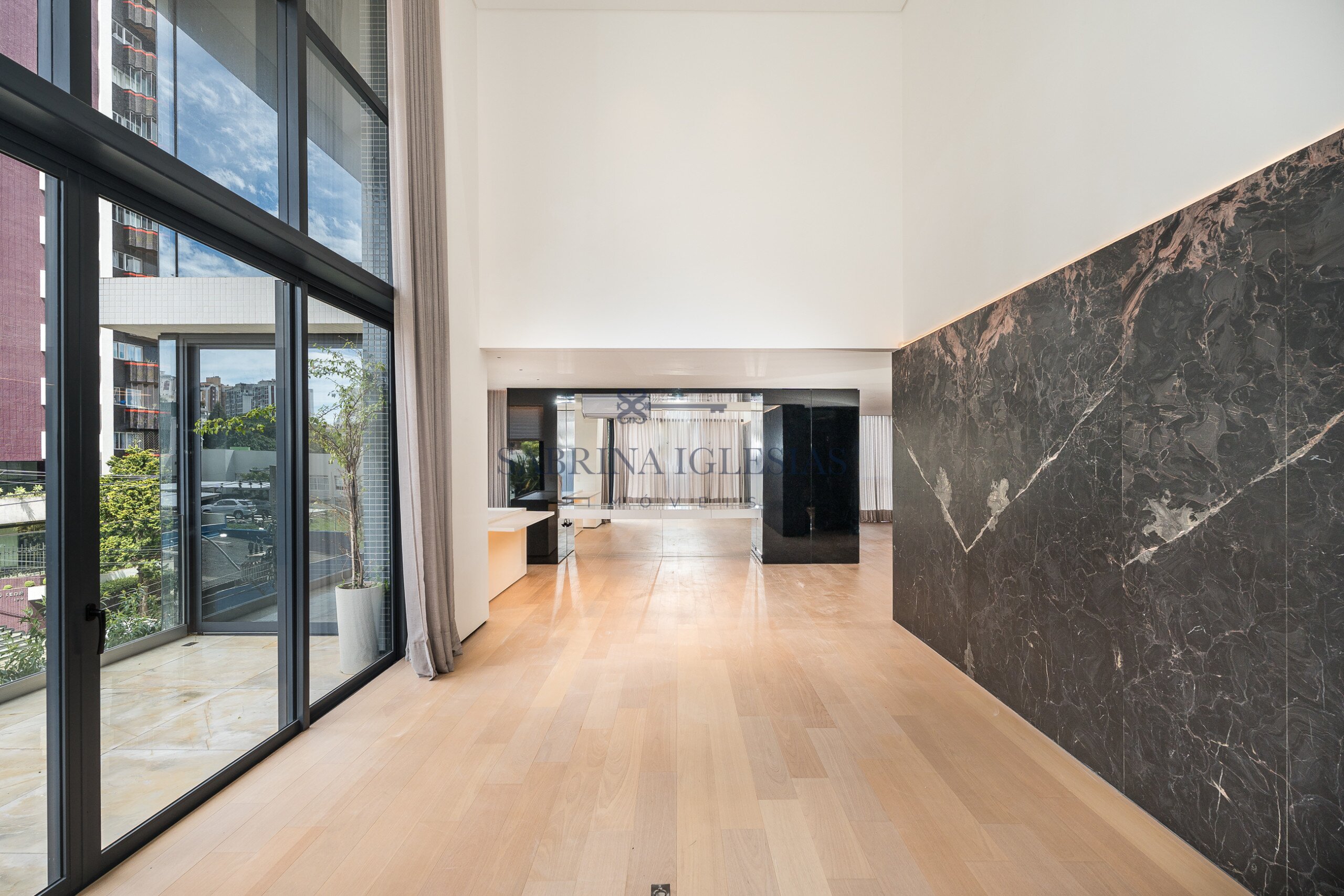 O elevador social (com senha) dá acesso ao espaço que integra o living, home theater, sala de jantar, espaço gourmet (com churrasqueira escondida), varanda e um piano de cauda já na entrada. A cozinha fechada conta com uma ilha para refeições rápidas e pode ser acessada pela sala e pela área de serviço, que se conecta a área íntima da casa.