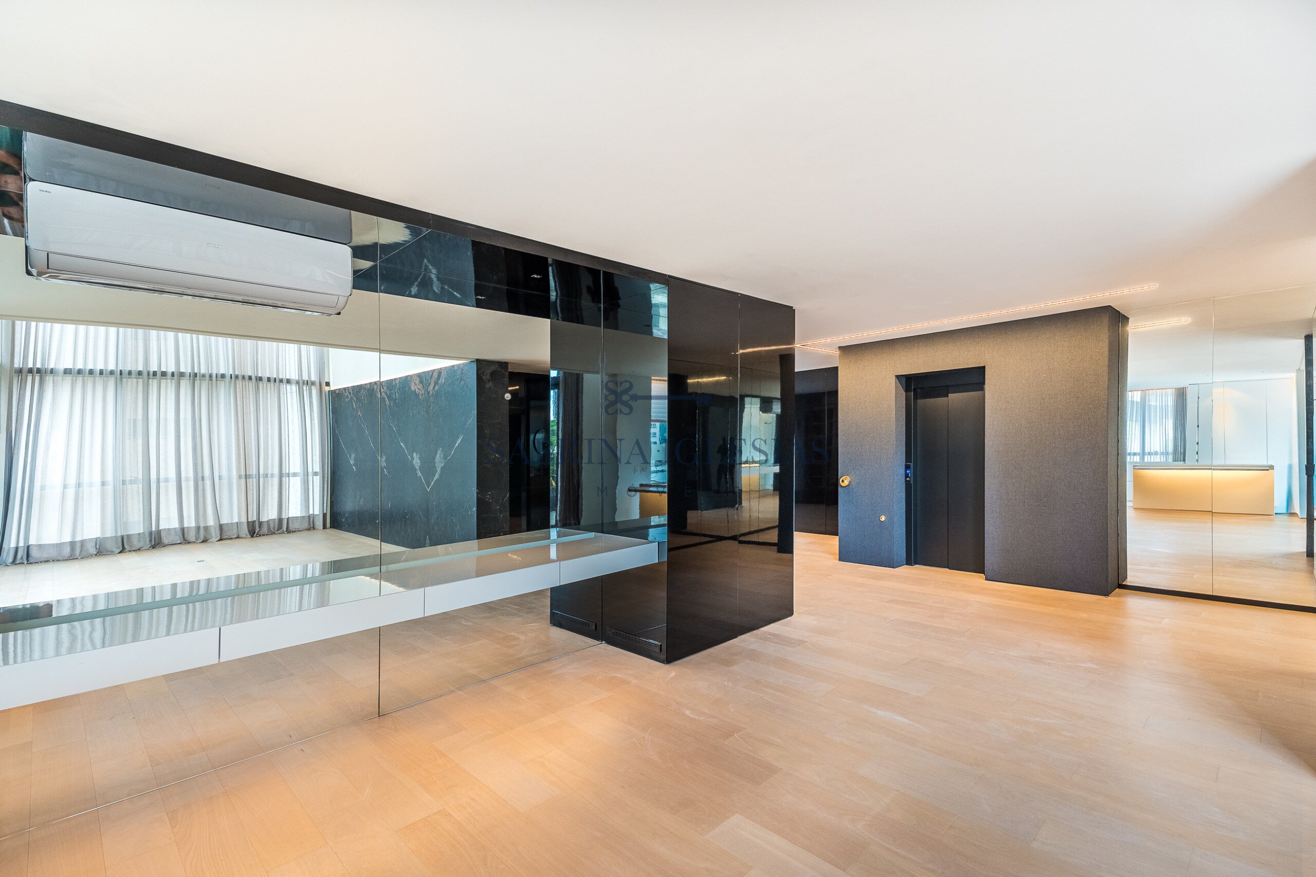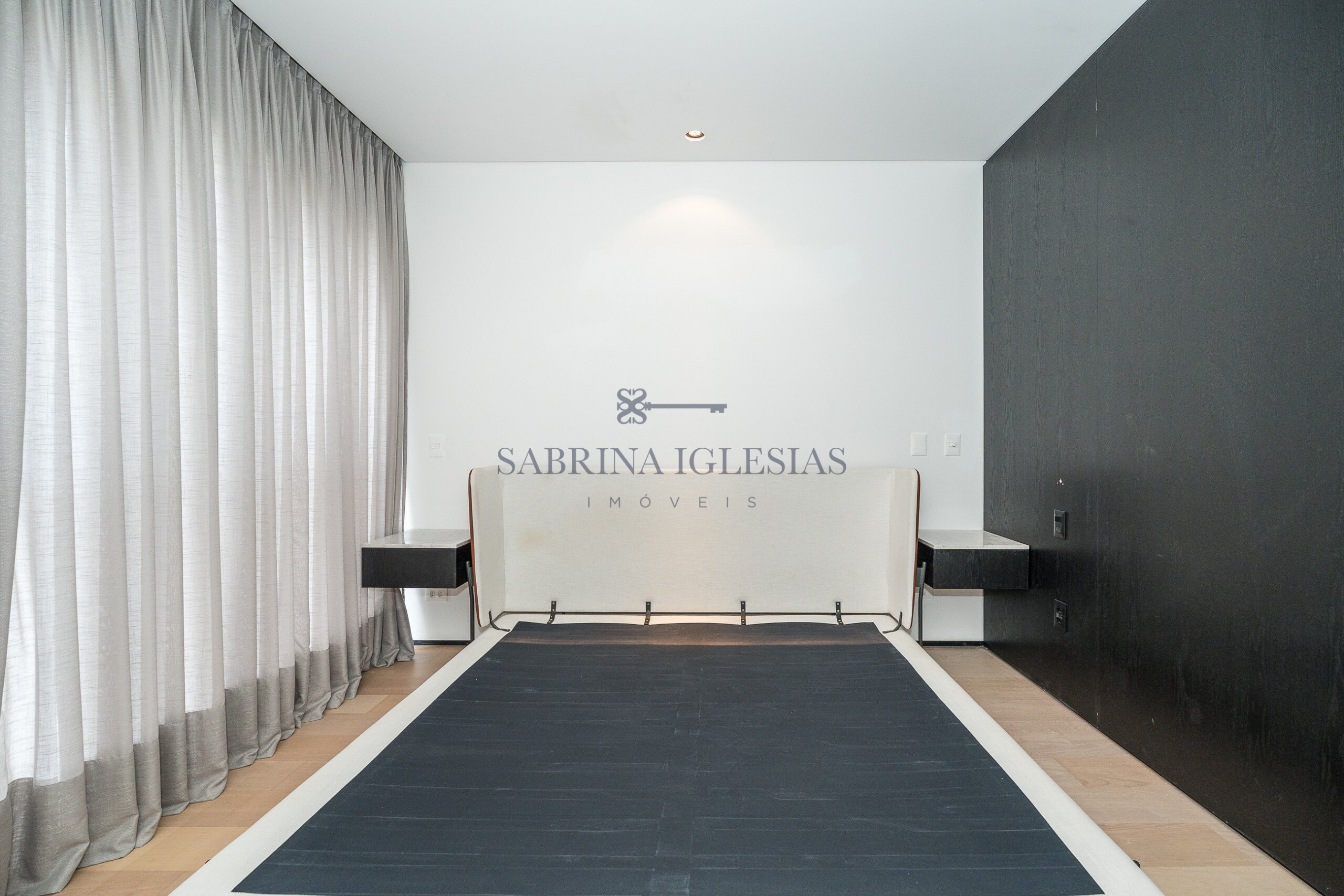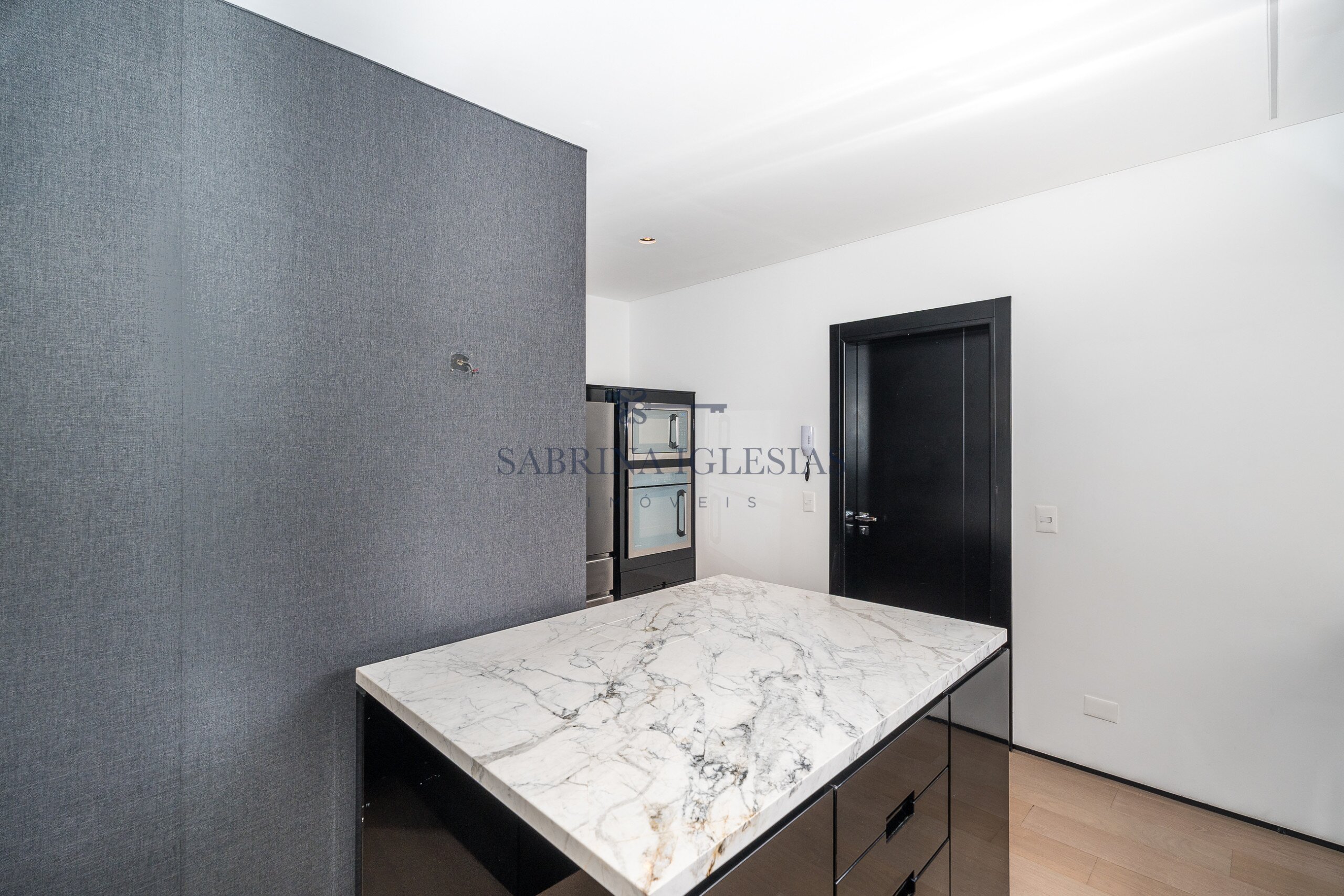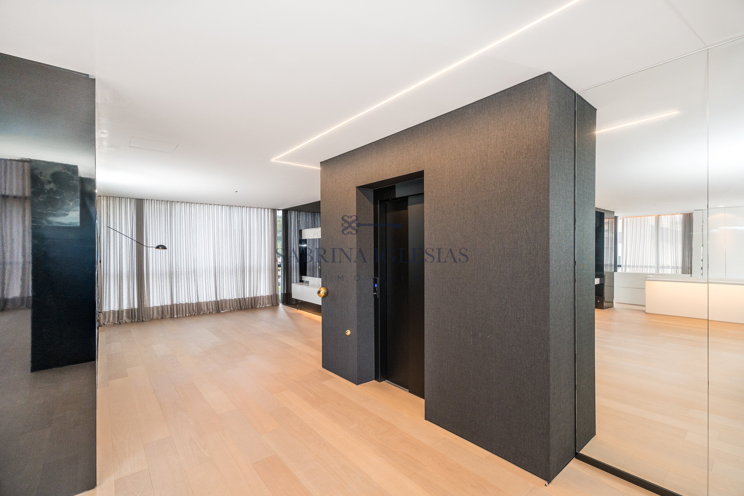 O elevador social (com senha) dá acesso ao espaço que integra o living, home theater, sala de jantar, espaço gourmet (com churrasqueira escondida), varanda e um piano de cauda já na entrada. A cozinha fechada conta com uma ilha para refeições rápidas e pode ser acessada pela sala e pela área de serviço, que se conecta a área íntima da casa.