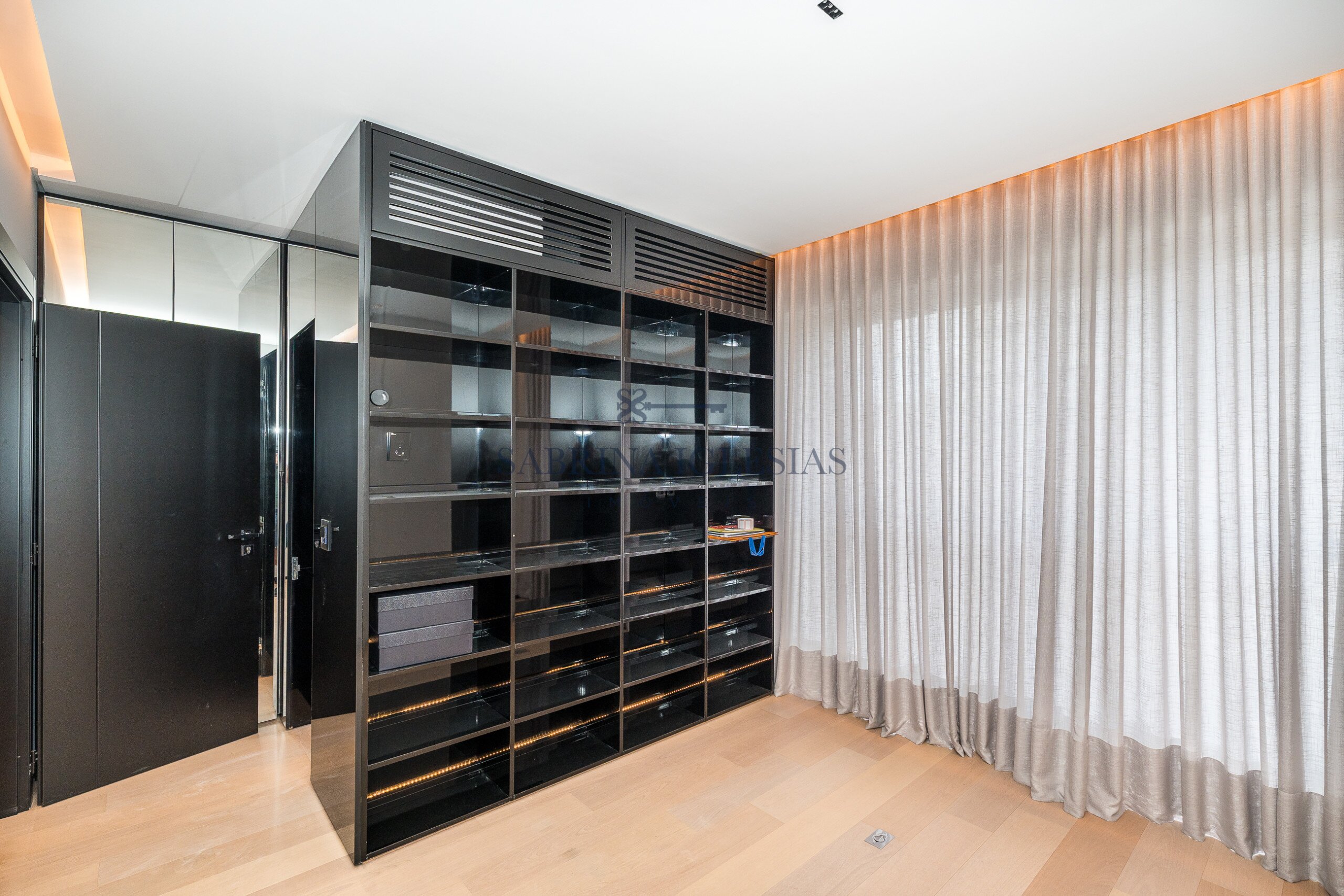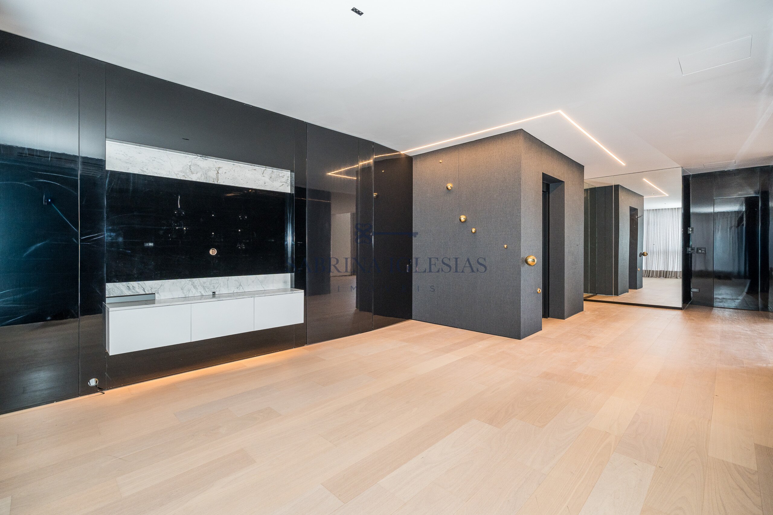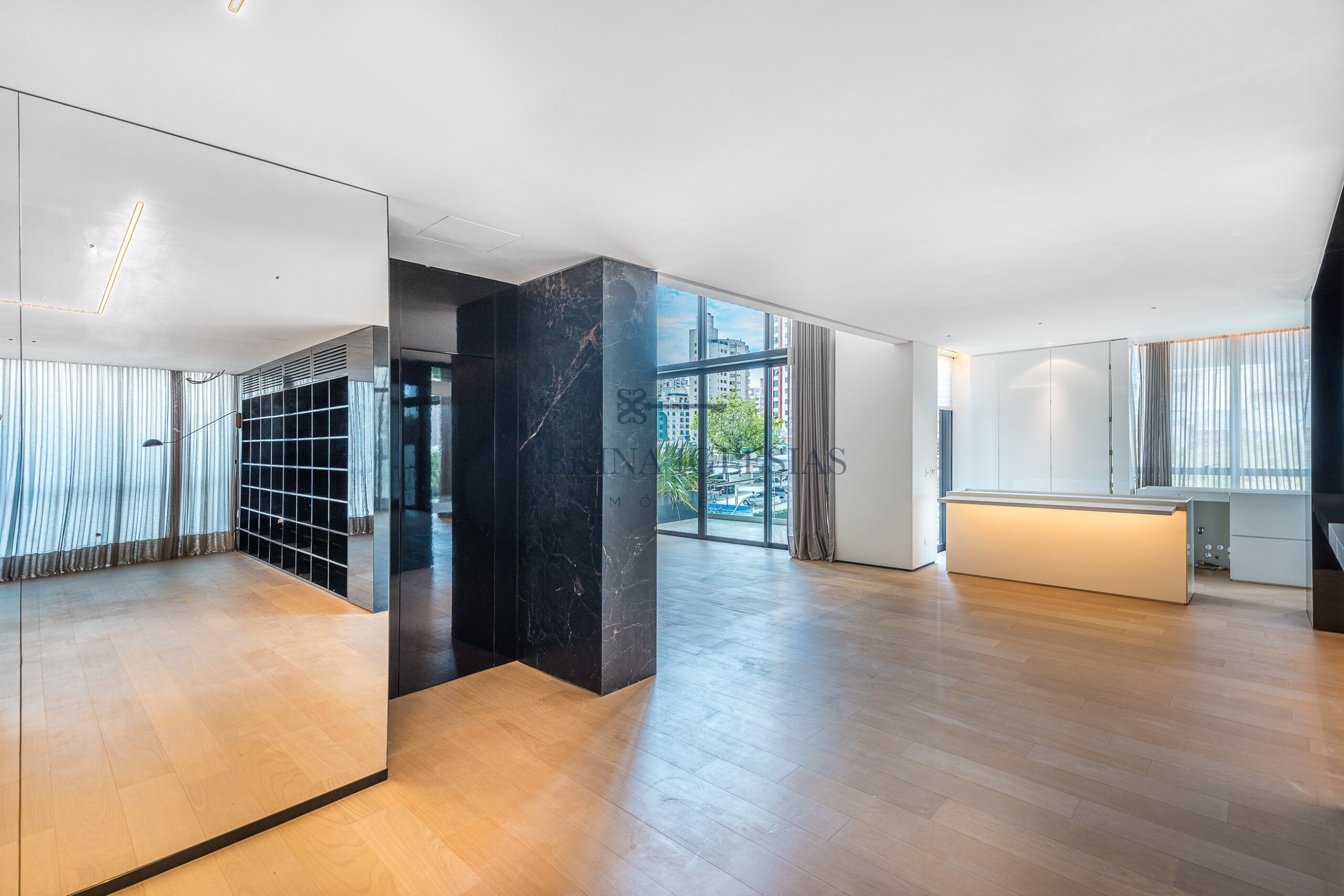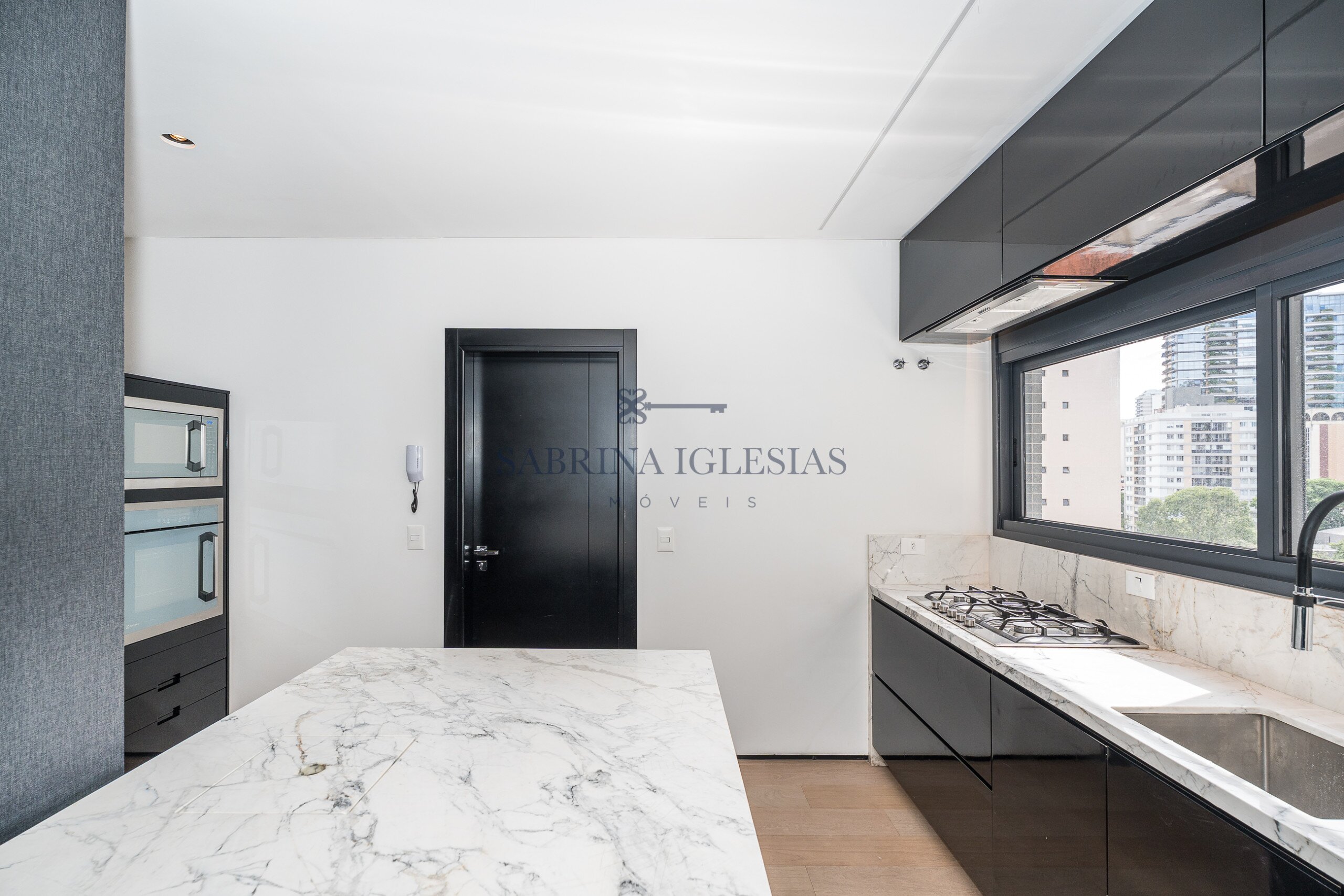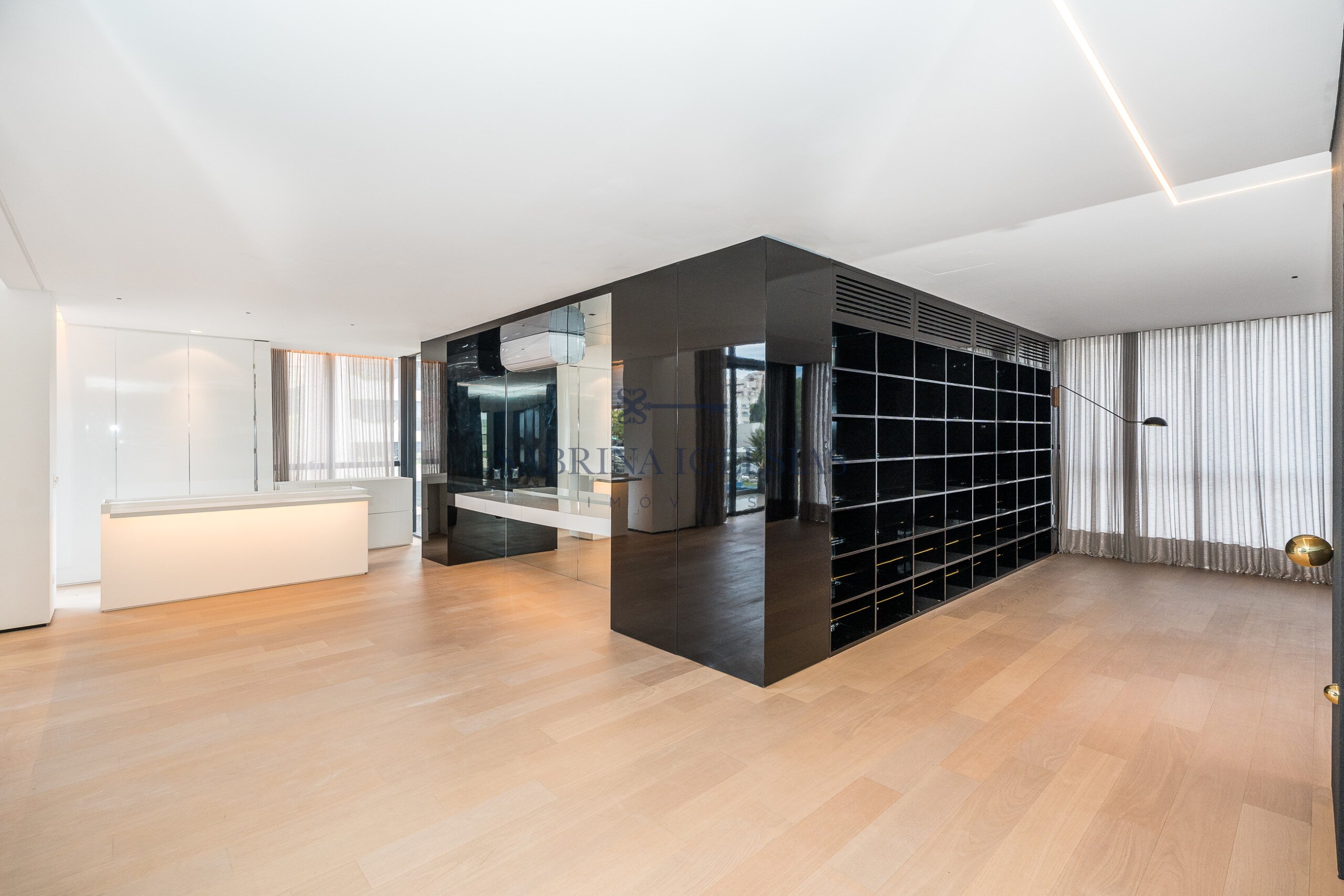 O elevador social (com senha) dá acesso ao espaço que integra o living, home theater, sala de jantar, espaço gourmet (com churrasqueira escondida), varanda e um piano de cauda já na entrada. A cozinha fechada conta com uma ilha para refeições rápidas e pode ser acessada pela sala e pela área de serviço, que se conecta a área íntima da casa.