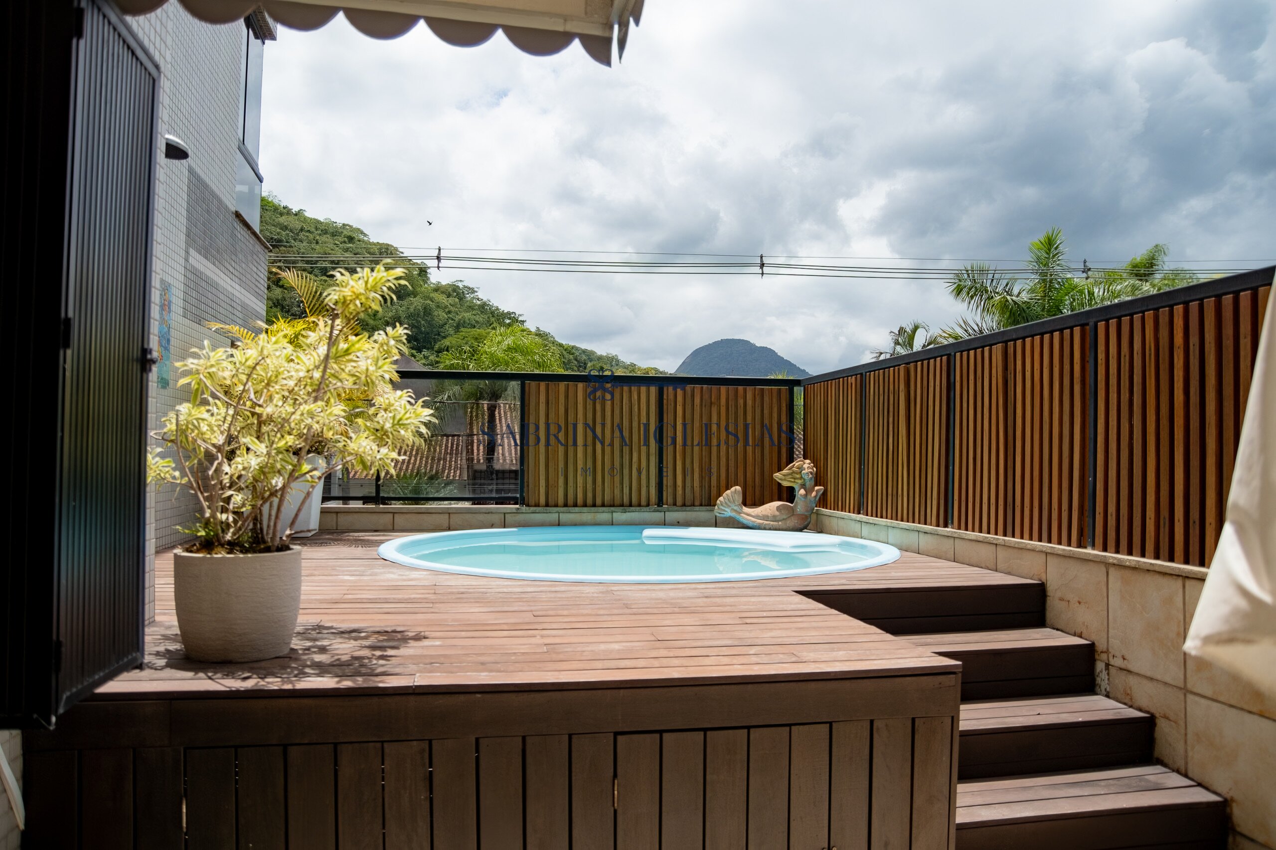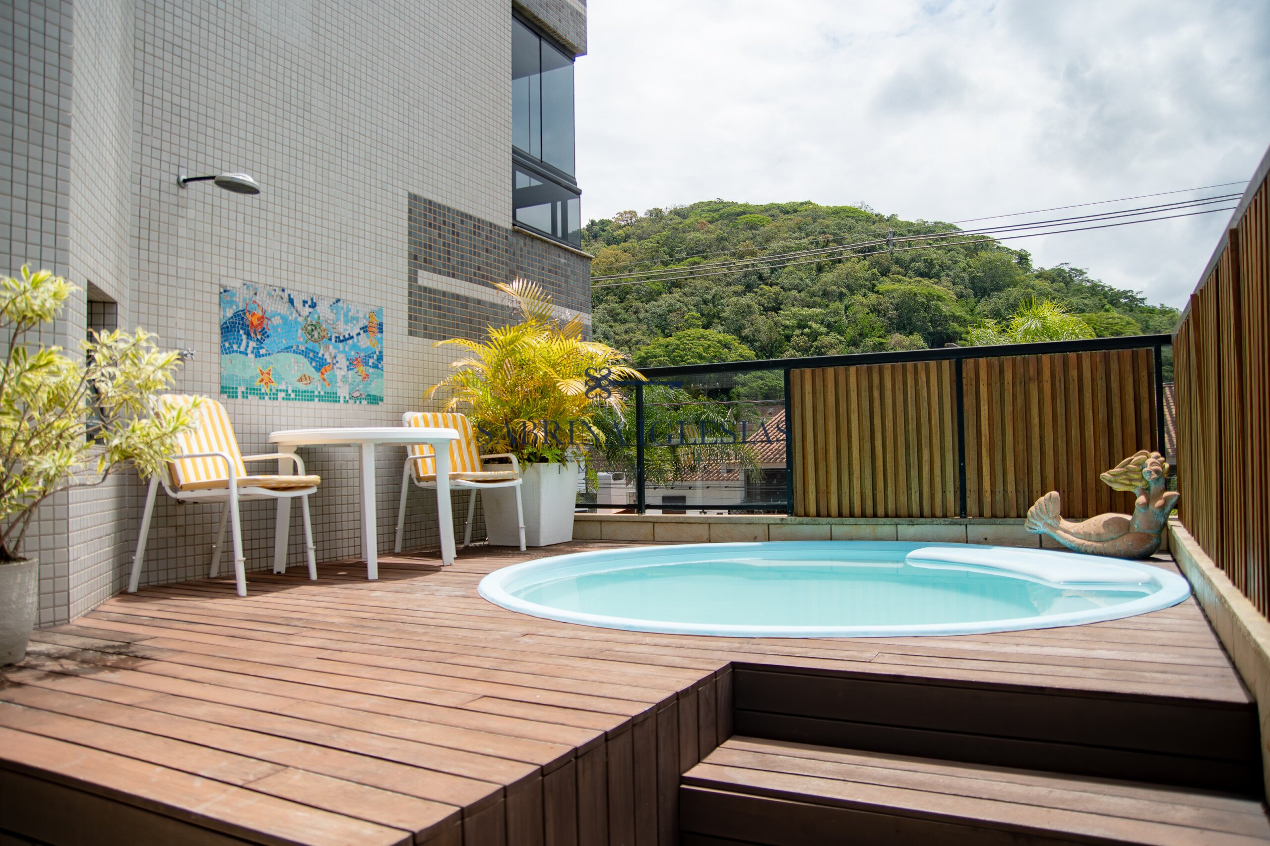 O diferencial está na área externa: uma piscina privativa com sala anexa, perfeita para momentos de descanso ou celebrações ao pôr do sol.