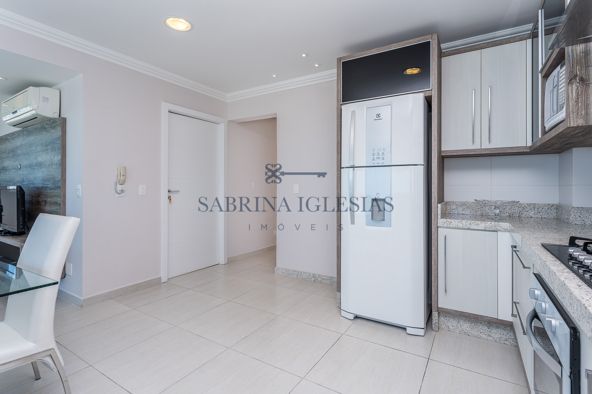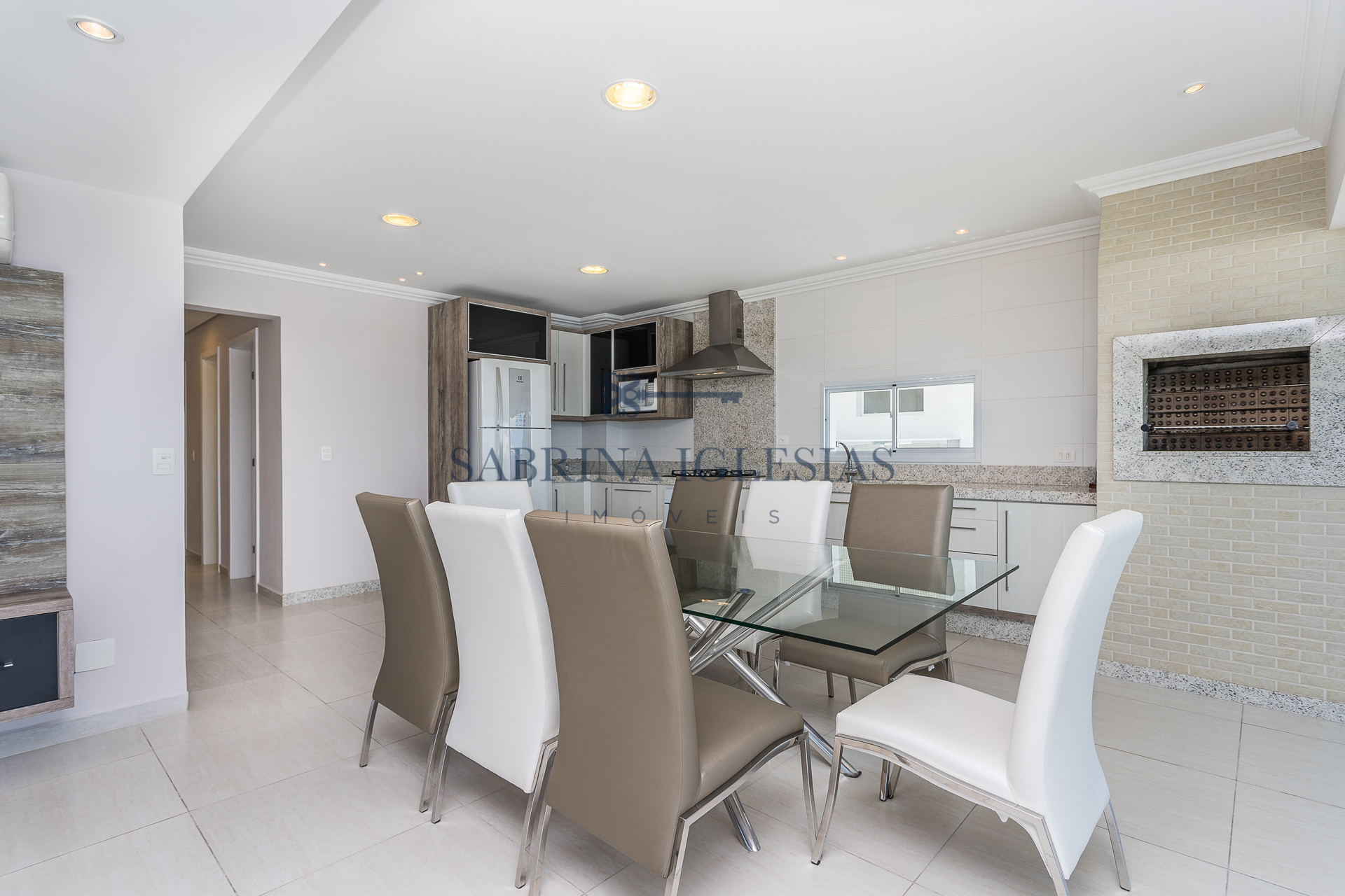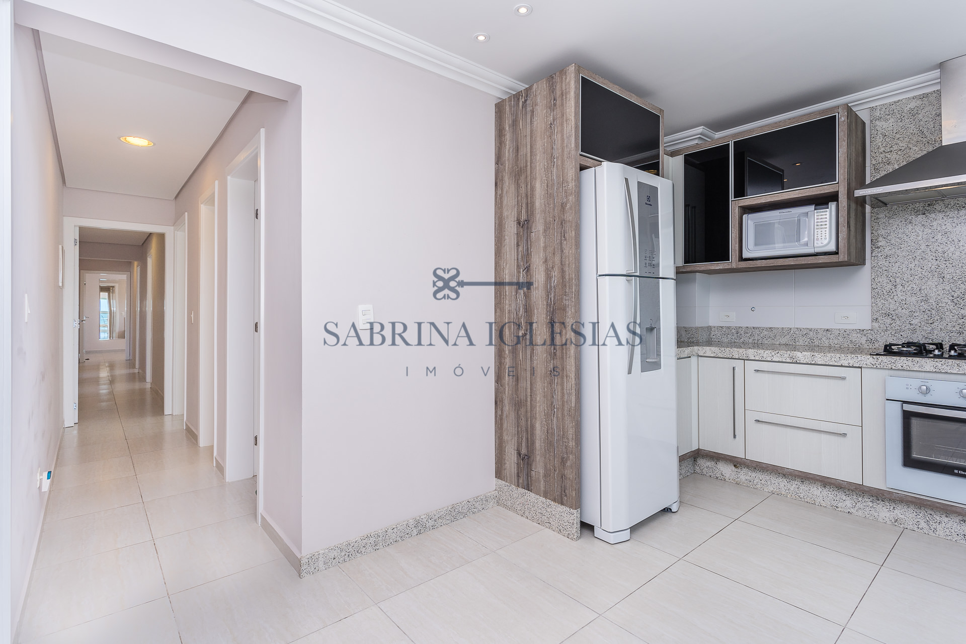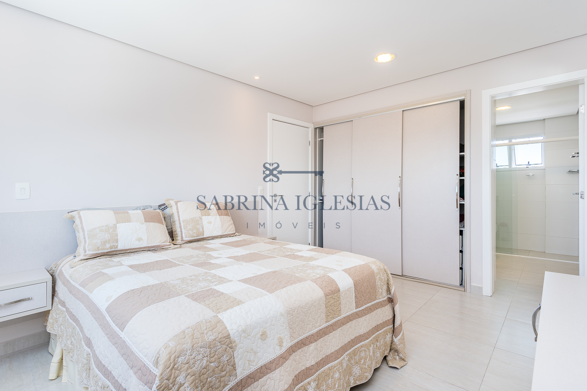 Teto rebaixado com iluminação embutida, armários na cozinha, dormitórios e banheiros.