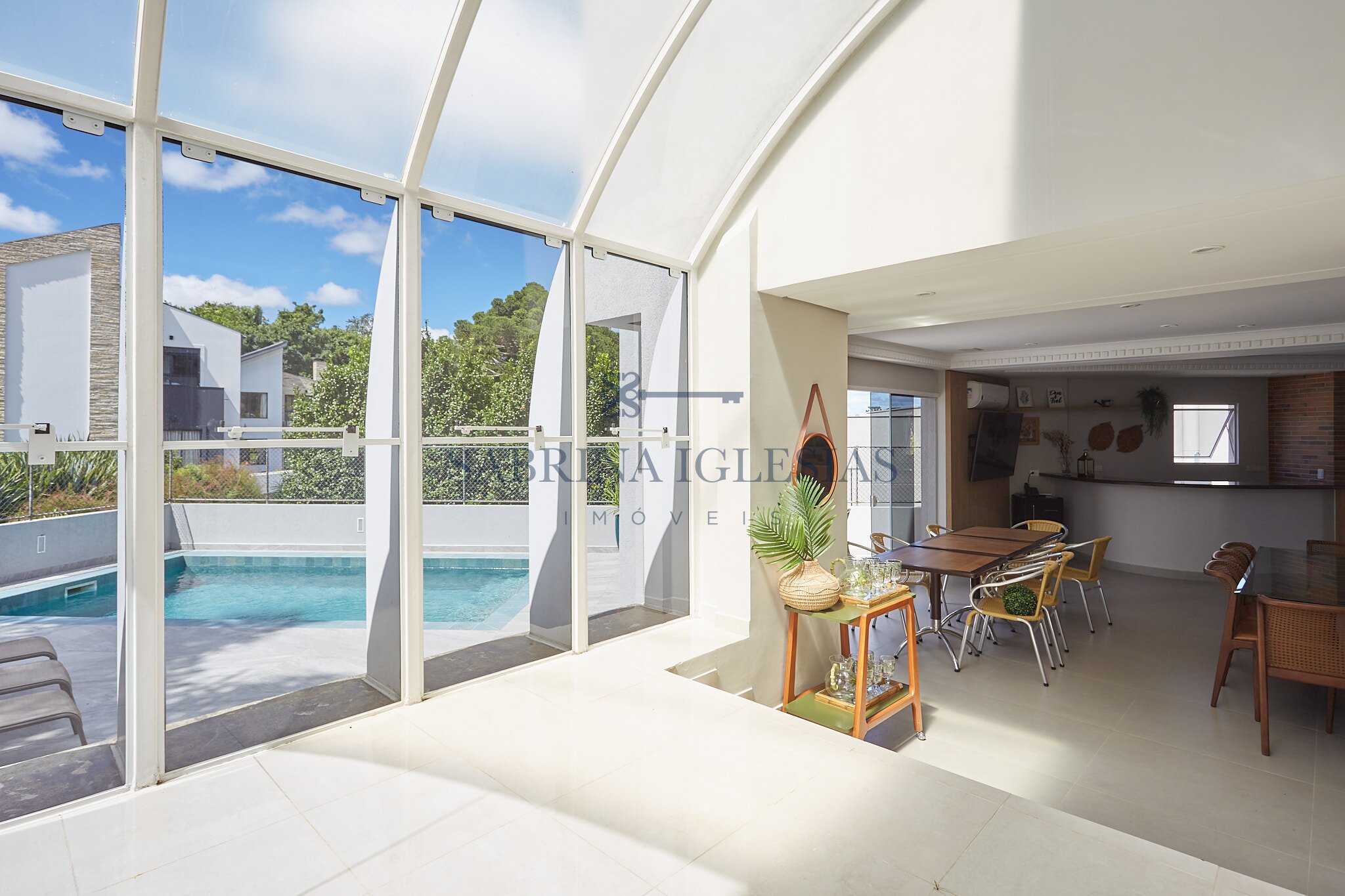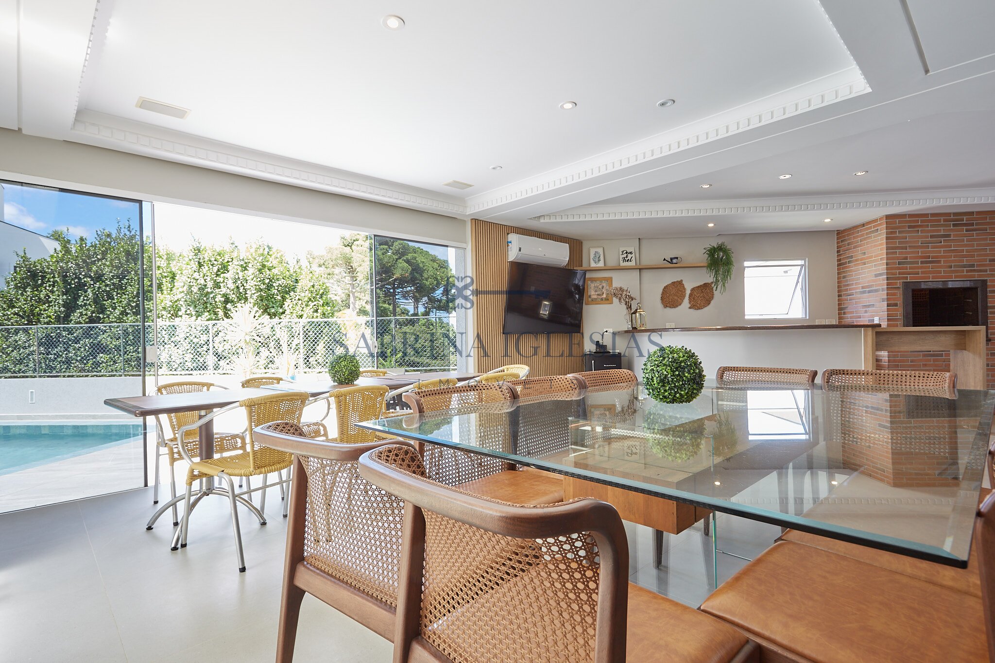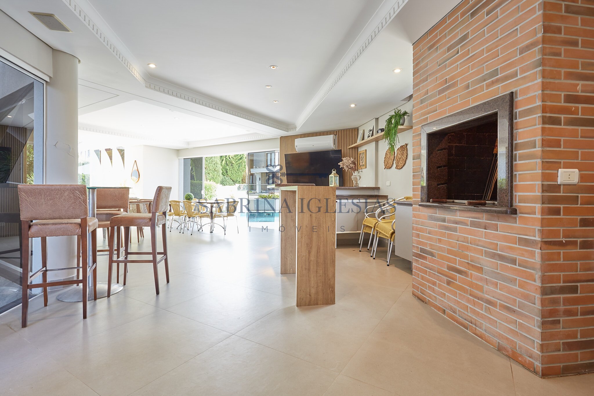 No pavimento principal, a sala de estar com pé-direito duplo e lareira cria um espaço elegante e acolhedor. A área social inclui ainda sala de jantar e sala de TV independente. O espaço gourmet com churrasqueira a carvão se integra diretamente à área externa com piscina e banheiro de apoio, formando um ambiente ideal para momentos de lazer e convivência.