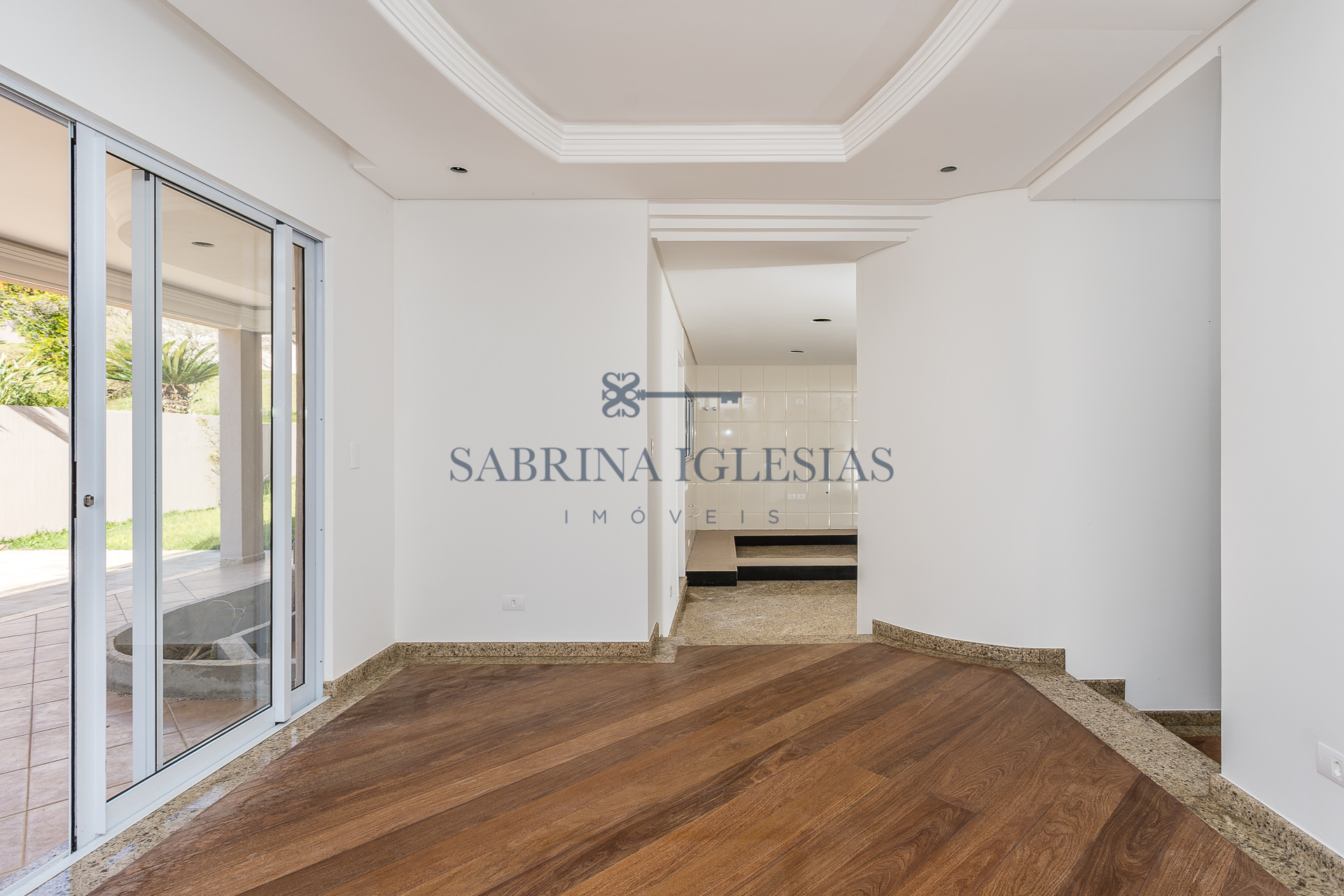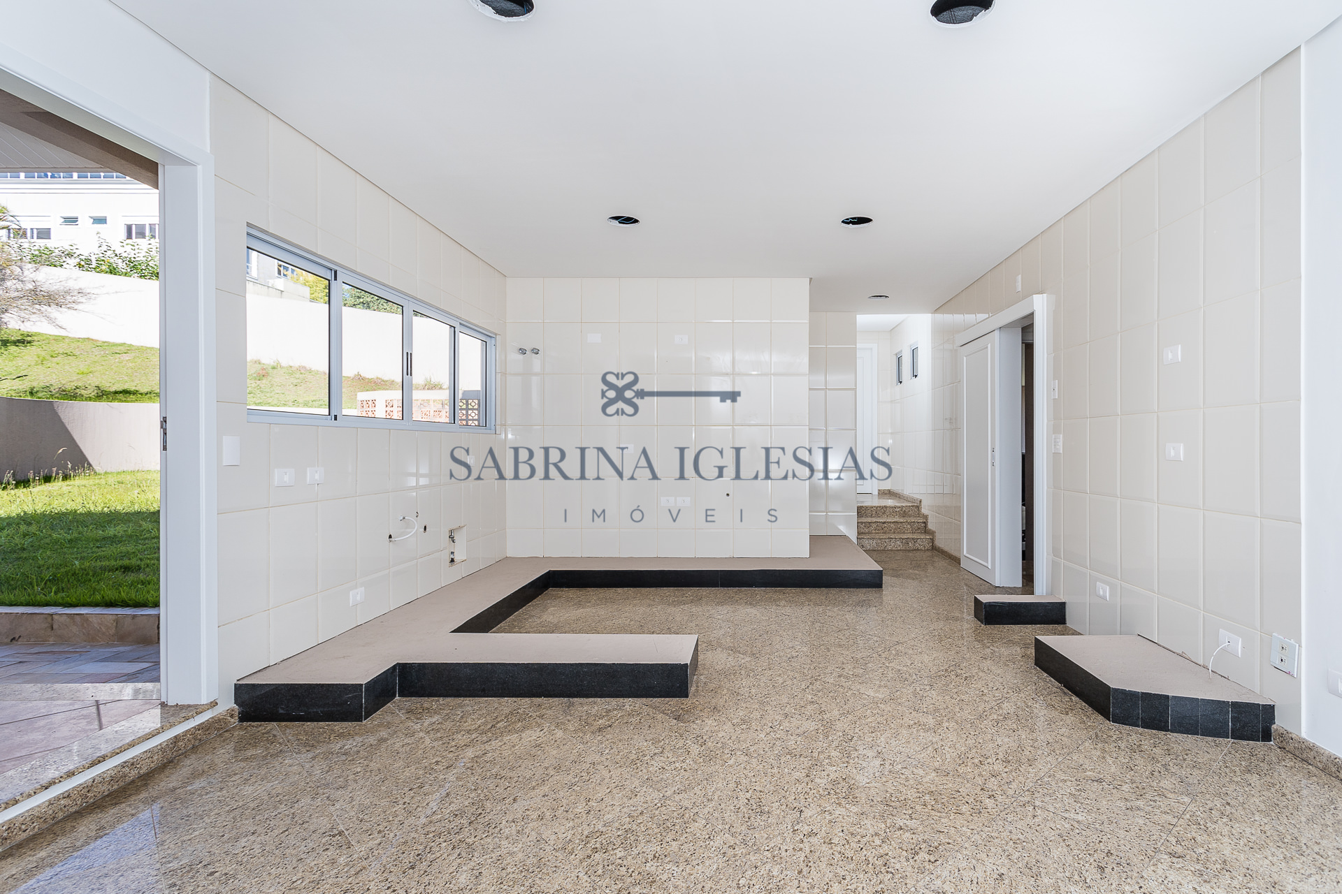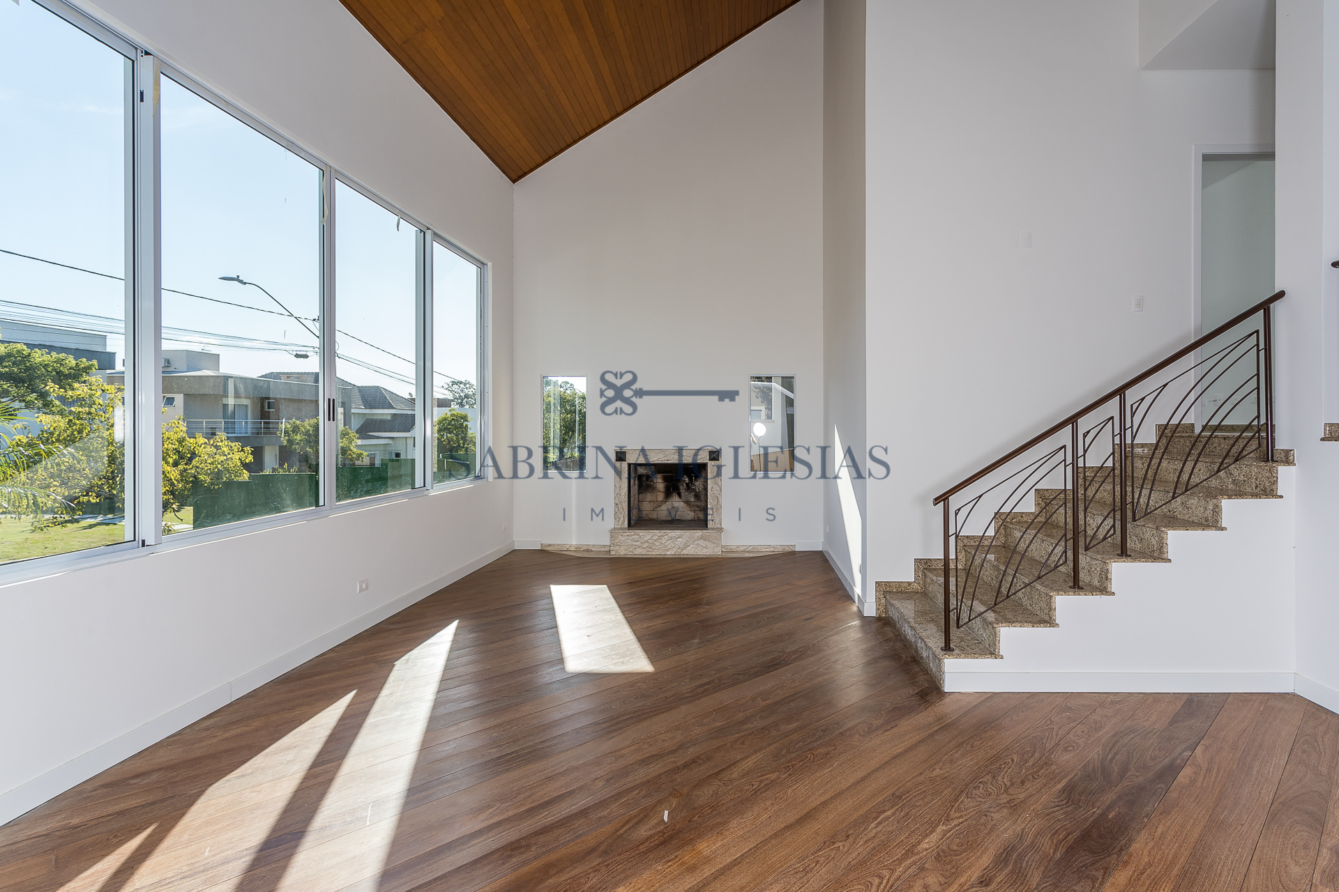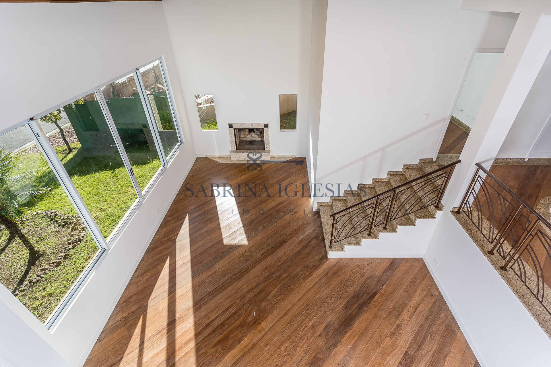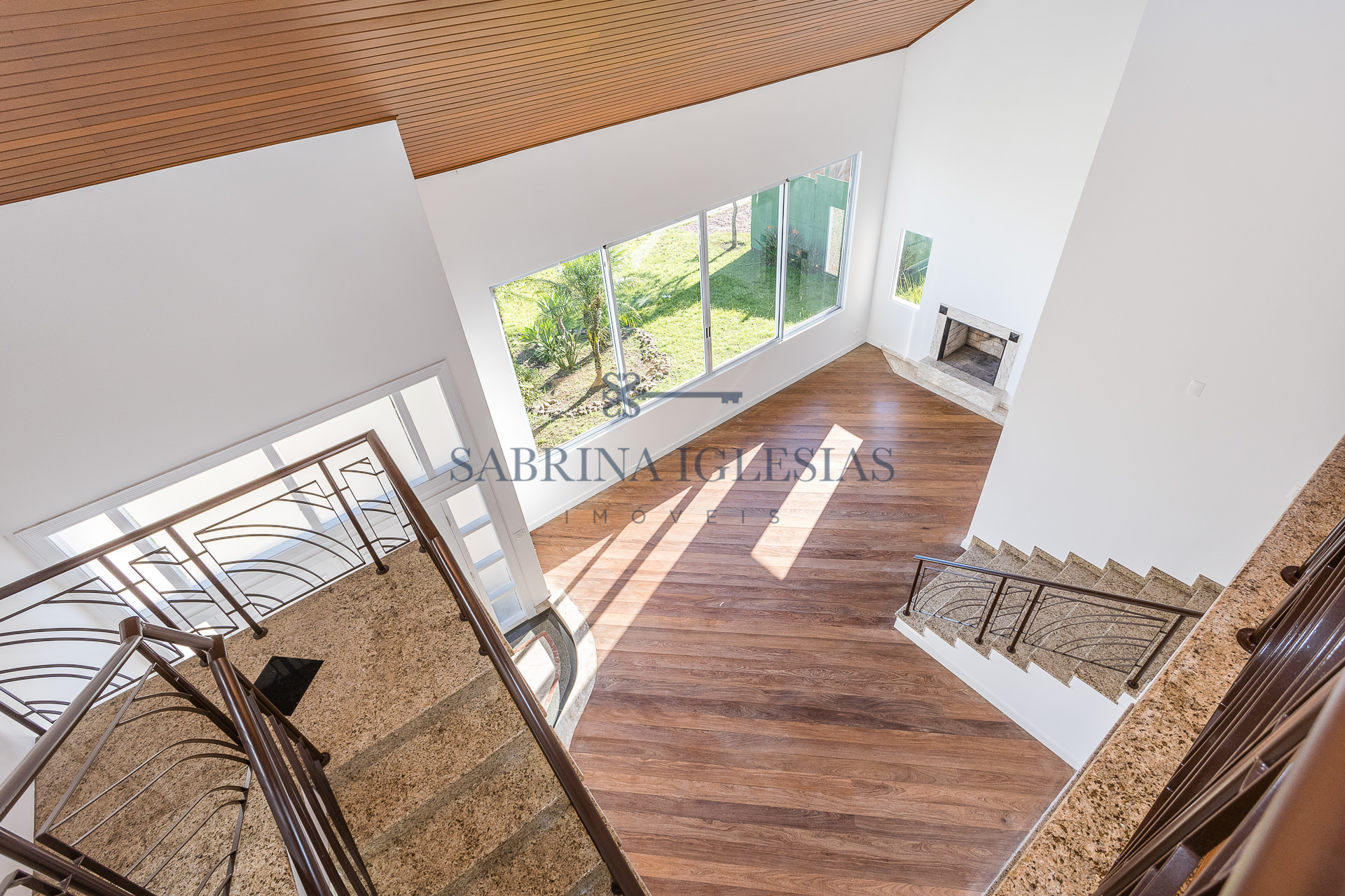 No piso inferior uma ampla sala para 2 ambientes com lareira, estar íntimo ao lado do jardim de inverno. Escritório, lavabo, cozinha e área de serviço.