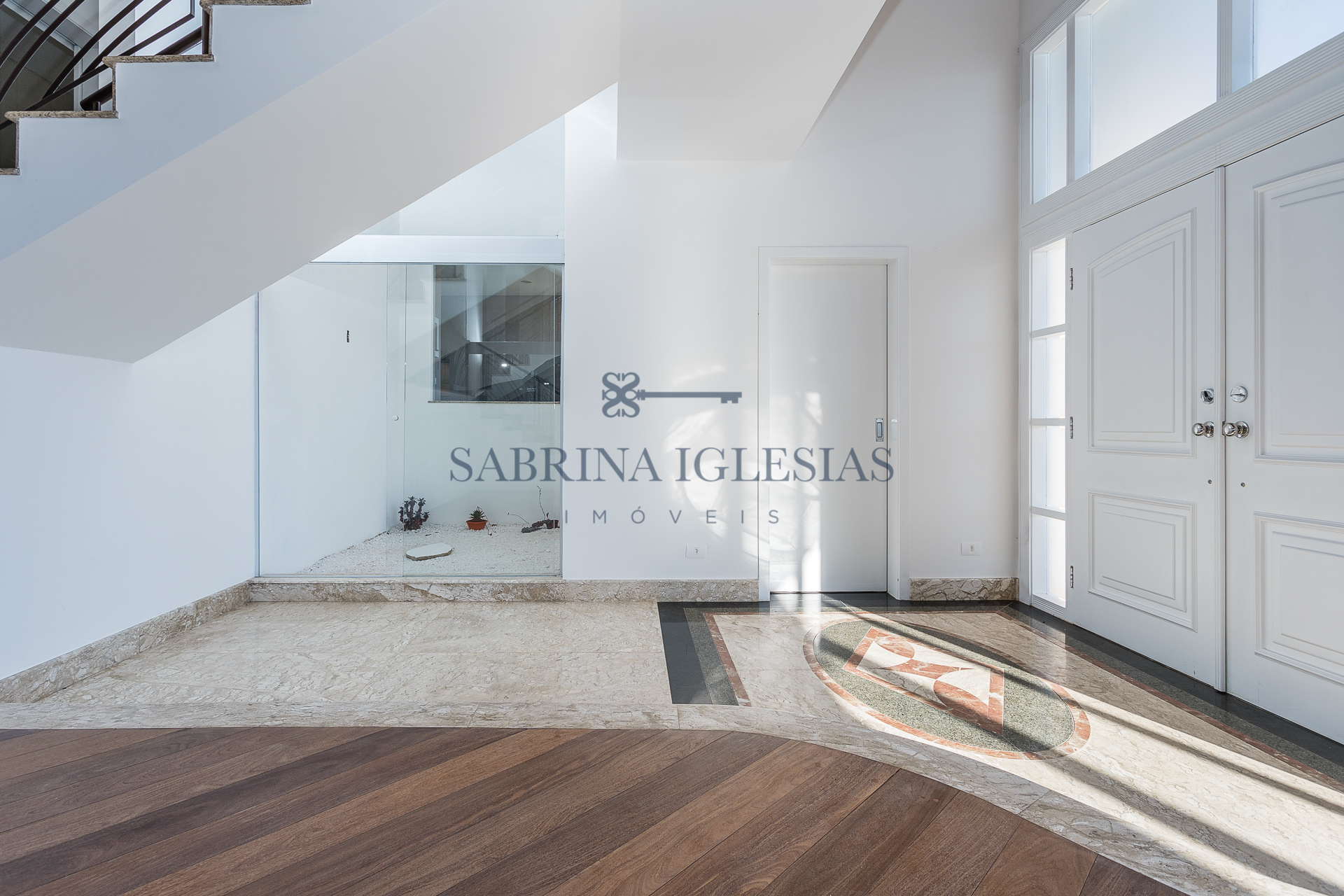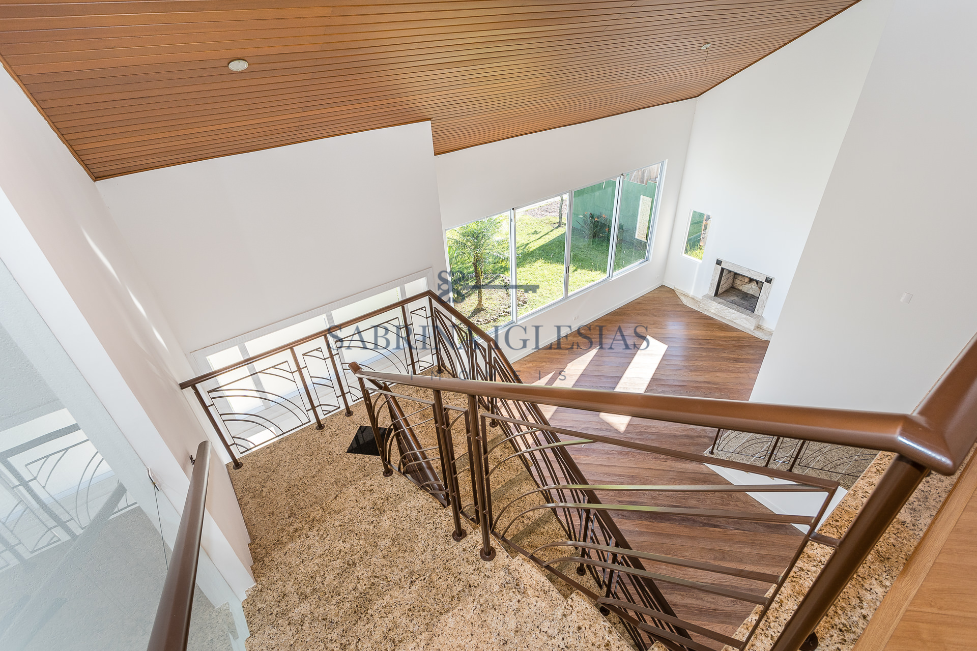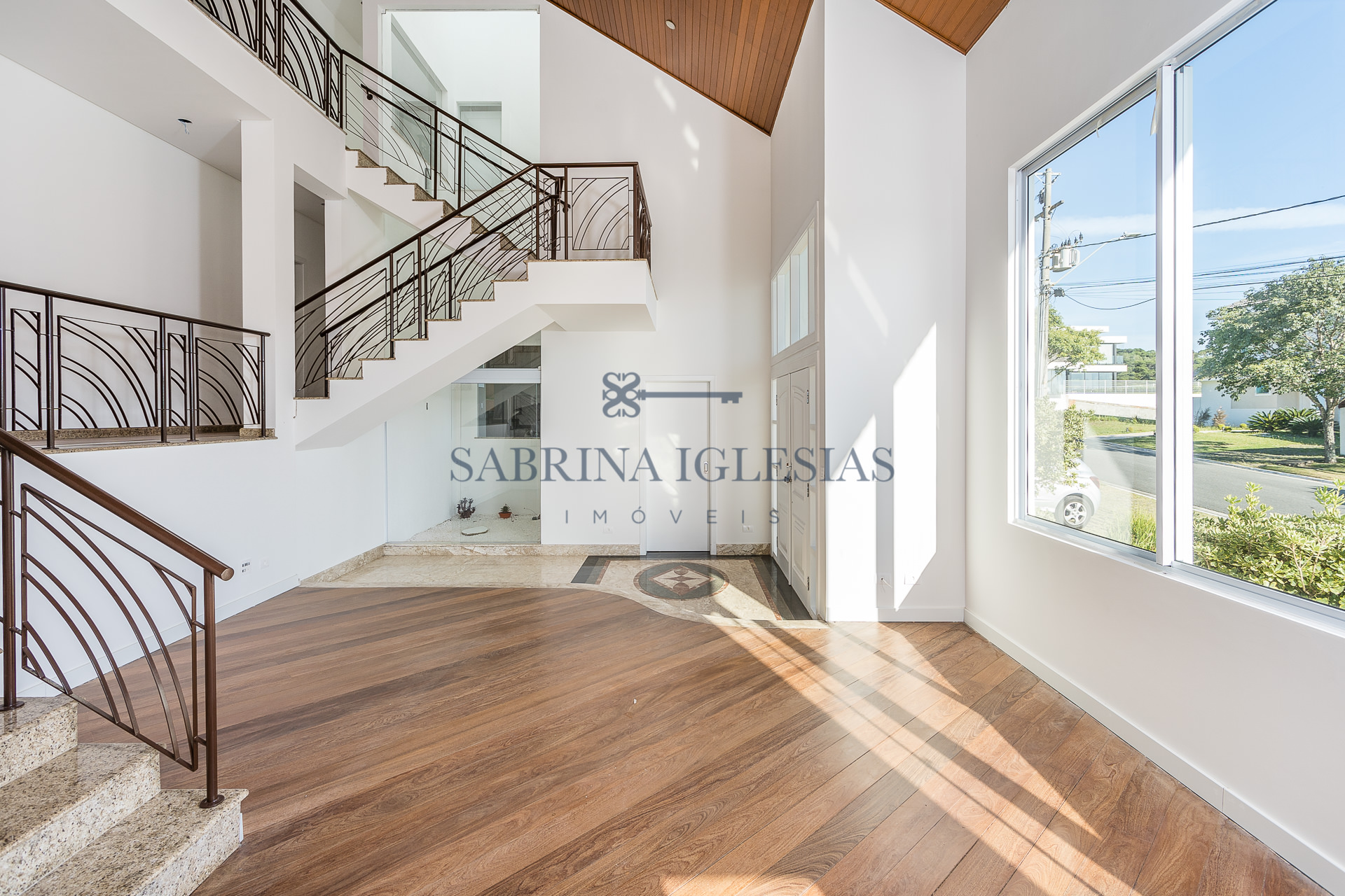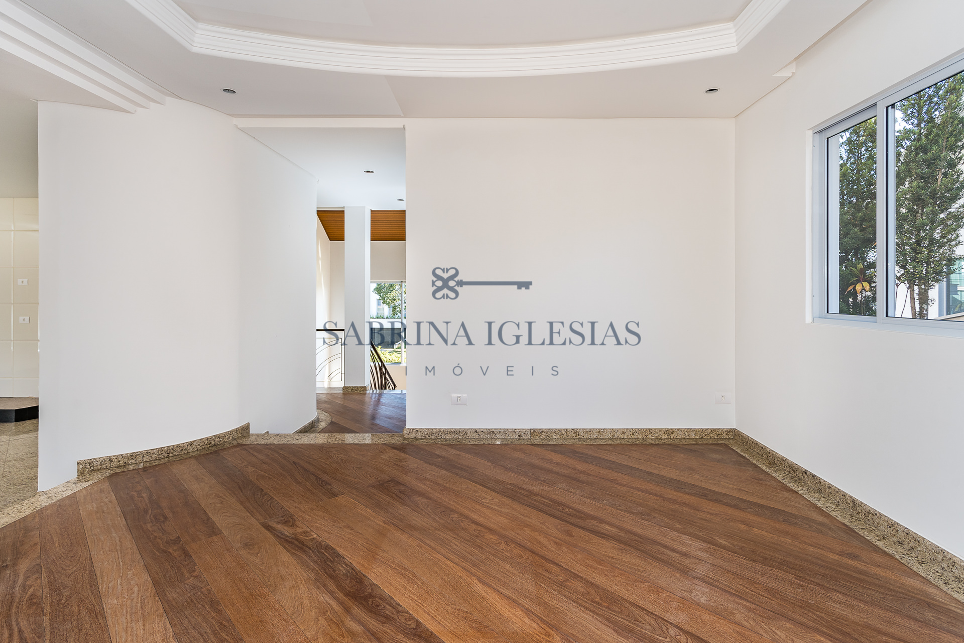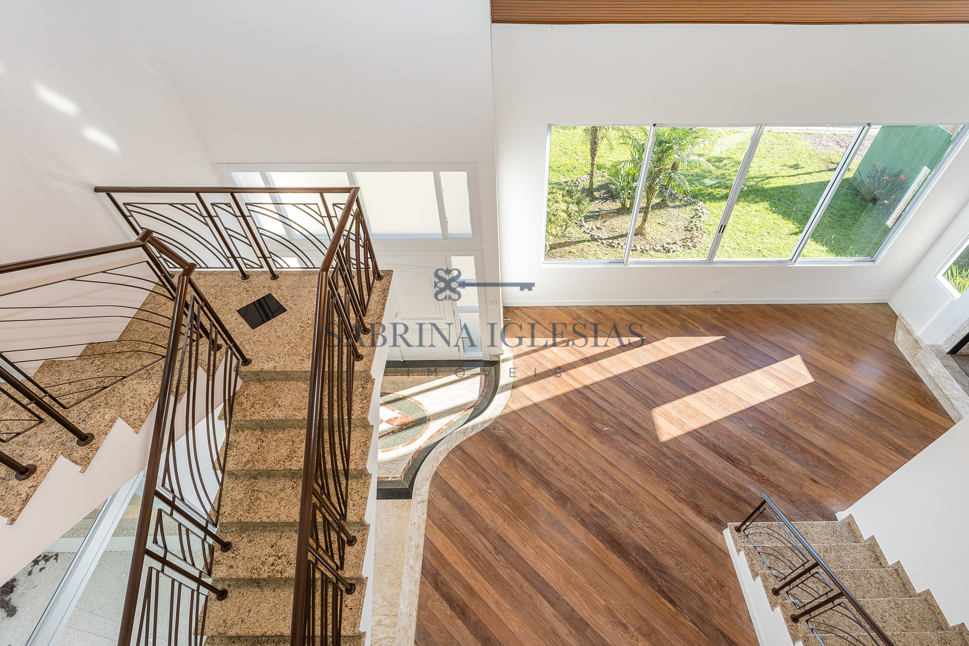 No piso inferior uma ampla sala para 2 ambientes com lareira, estar íntimo ao lado do jardim de inverno. Escritório, lavabo, cozinha e área de serviço.