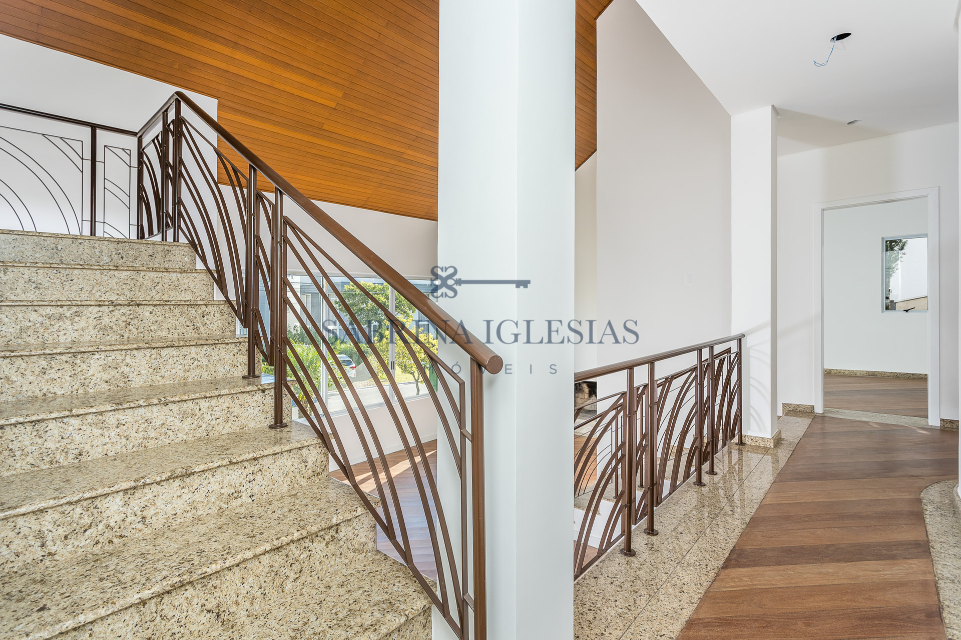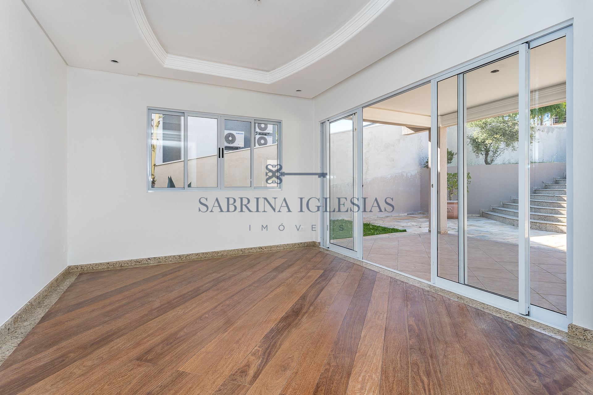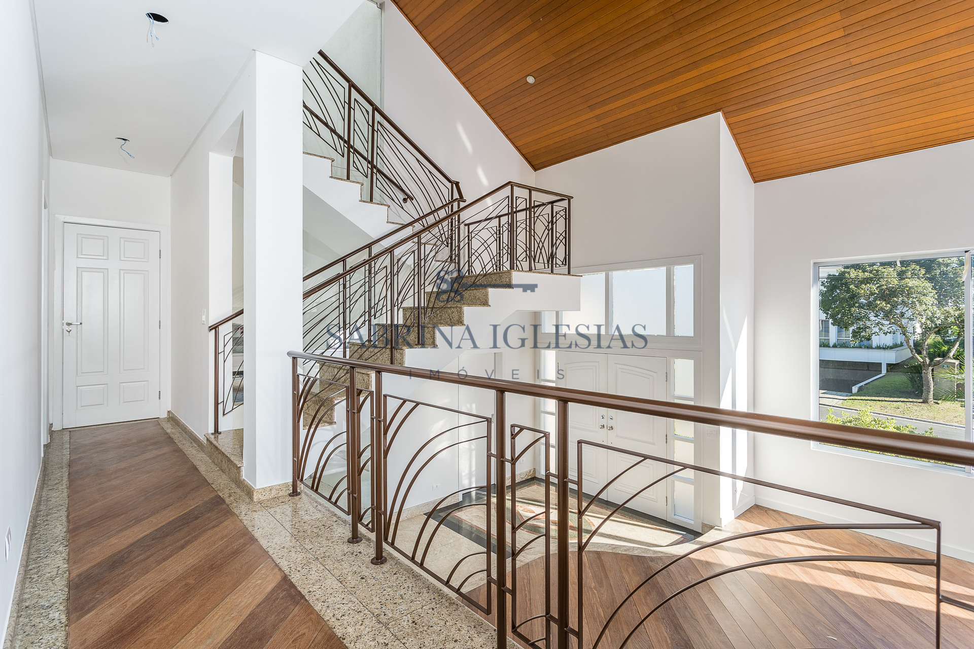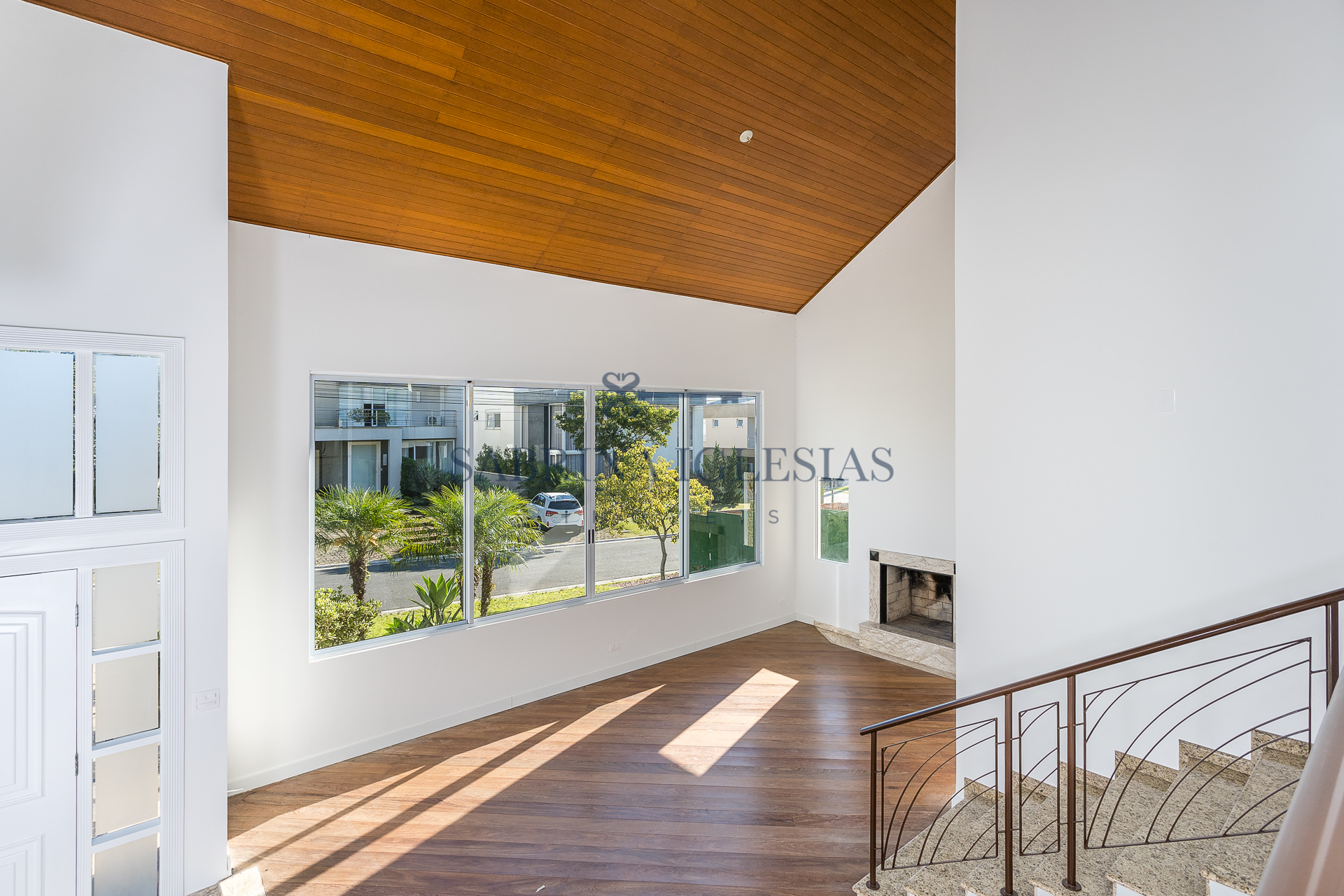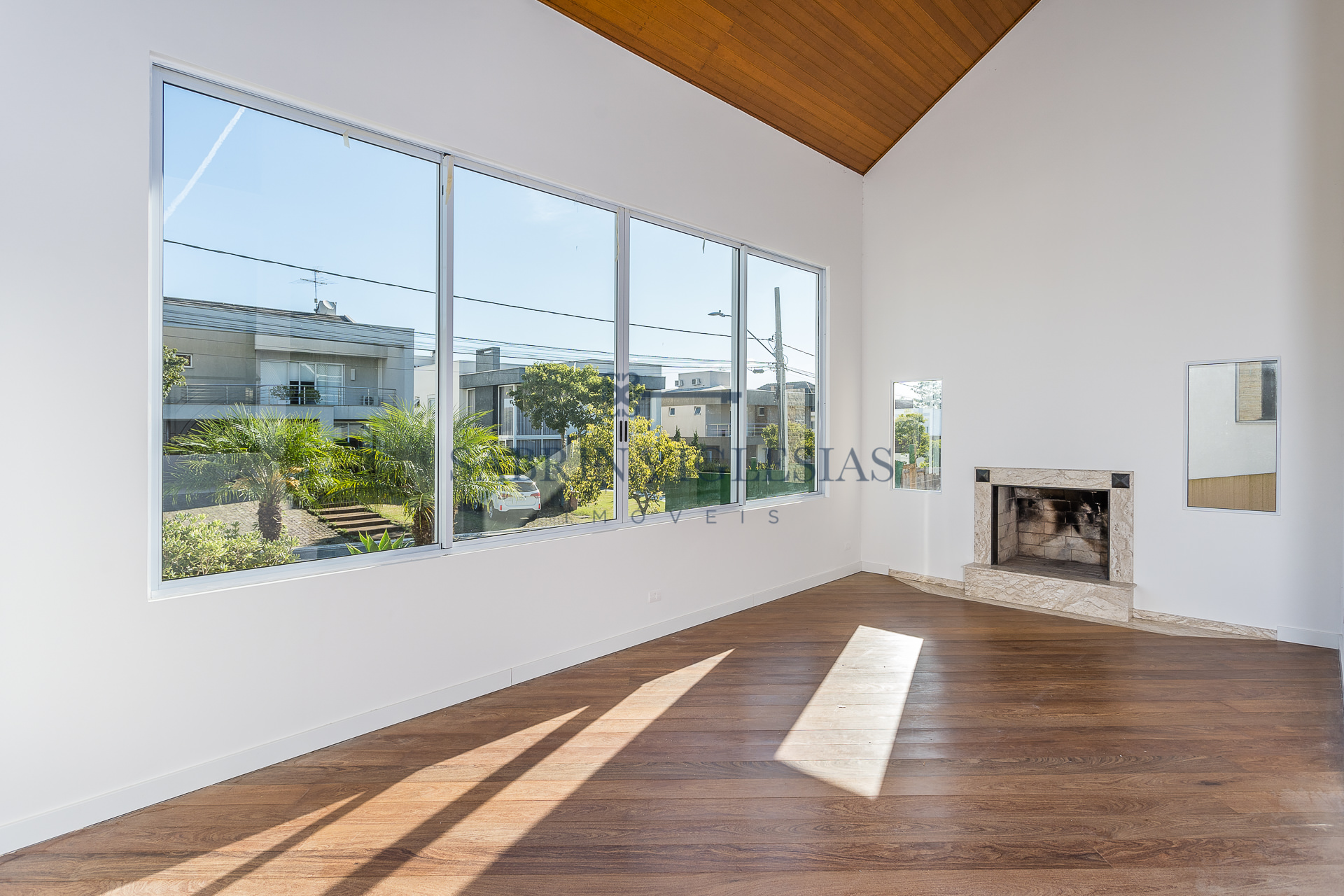 No piso inferior uma ampla sala para 2 ambientes com lareira, estar íntimo ao lado do jardim de inverno. Escritório, lavabo, cozinha e área de serviço.