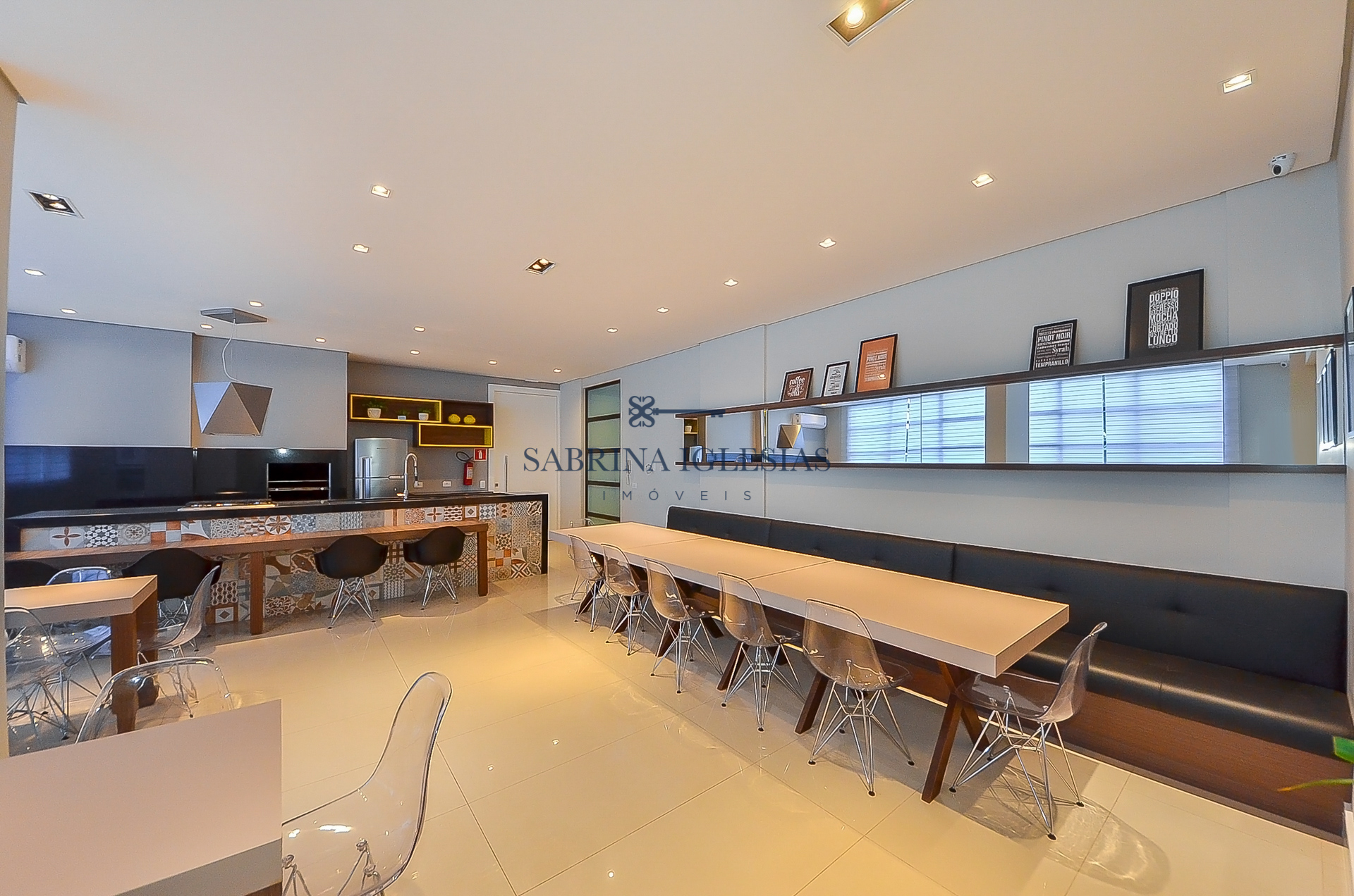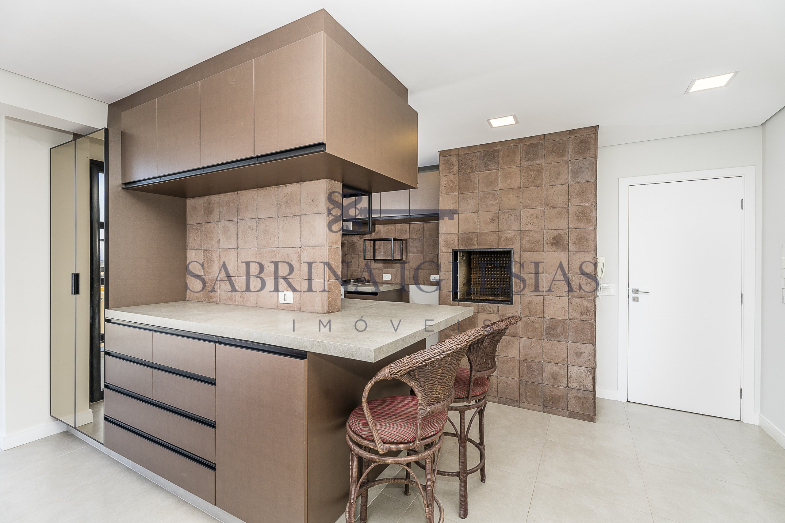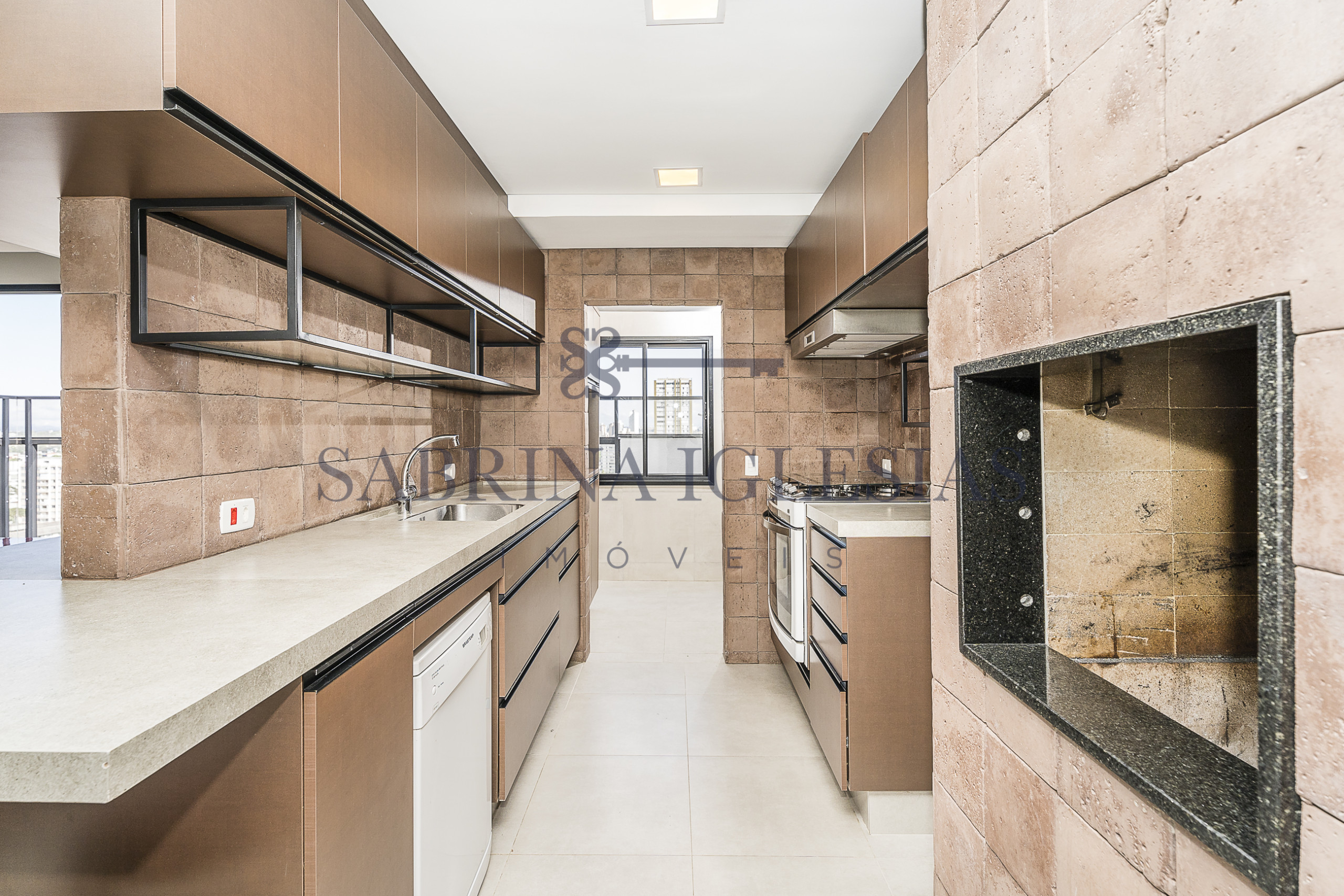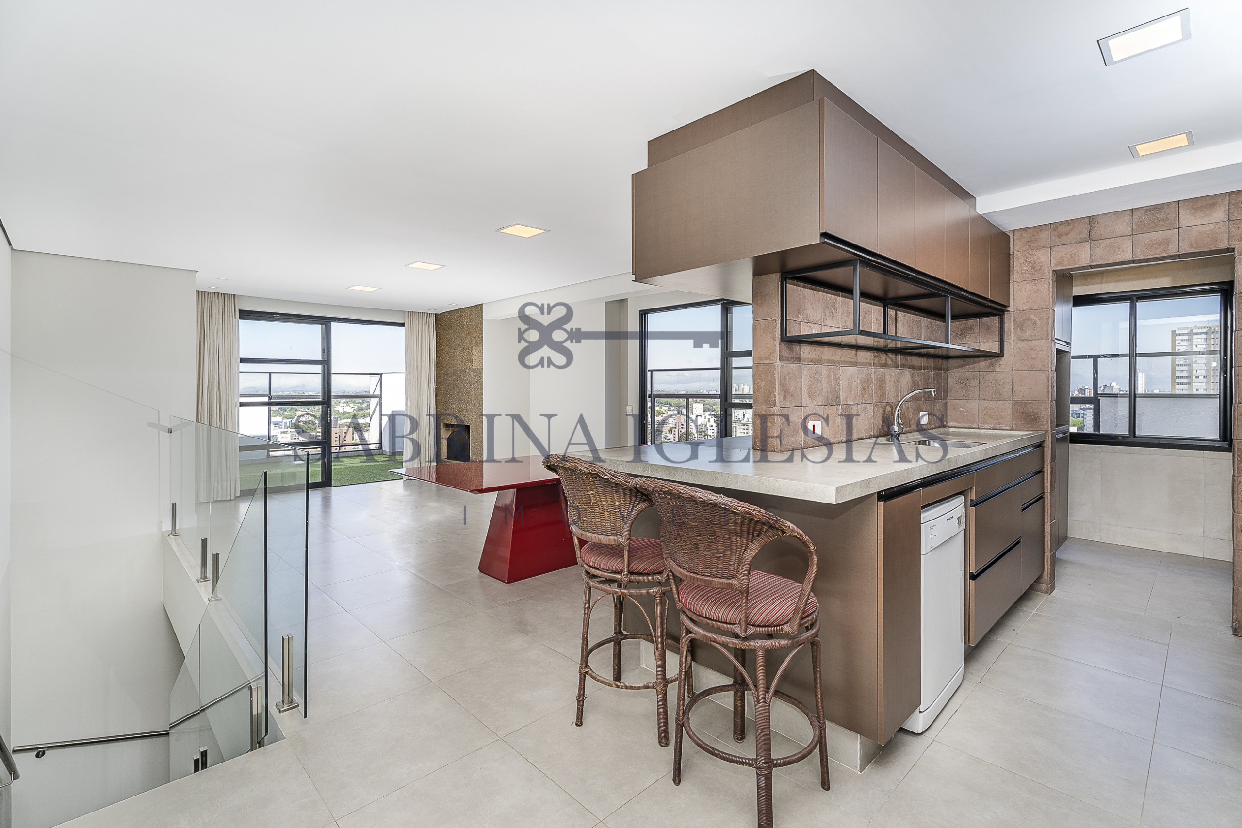 Moderna, ambiente social integrando estar com lareira, cozinha com churrasqueira.
