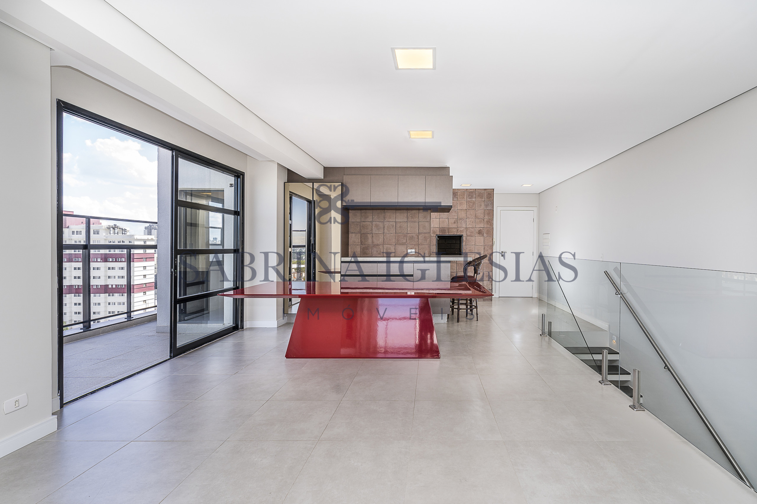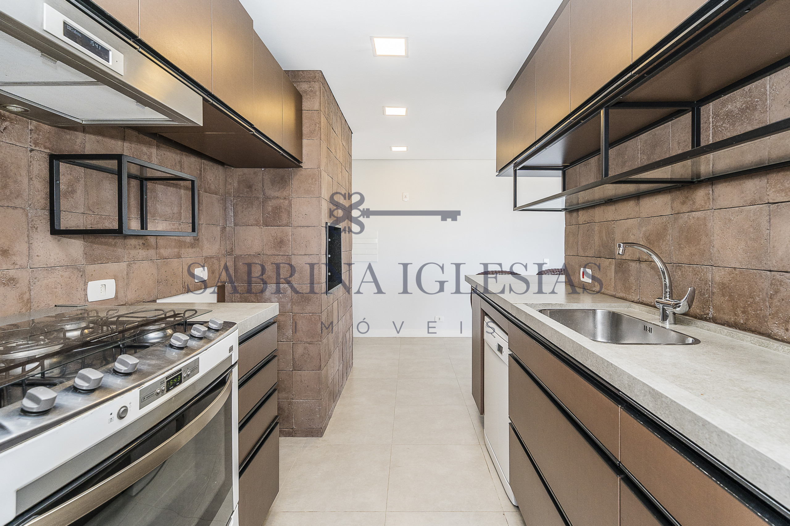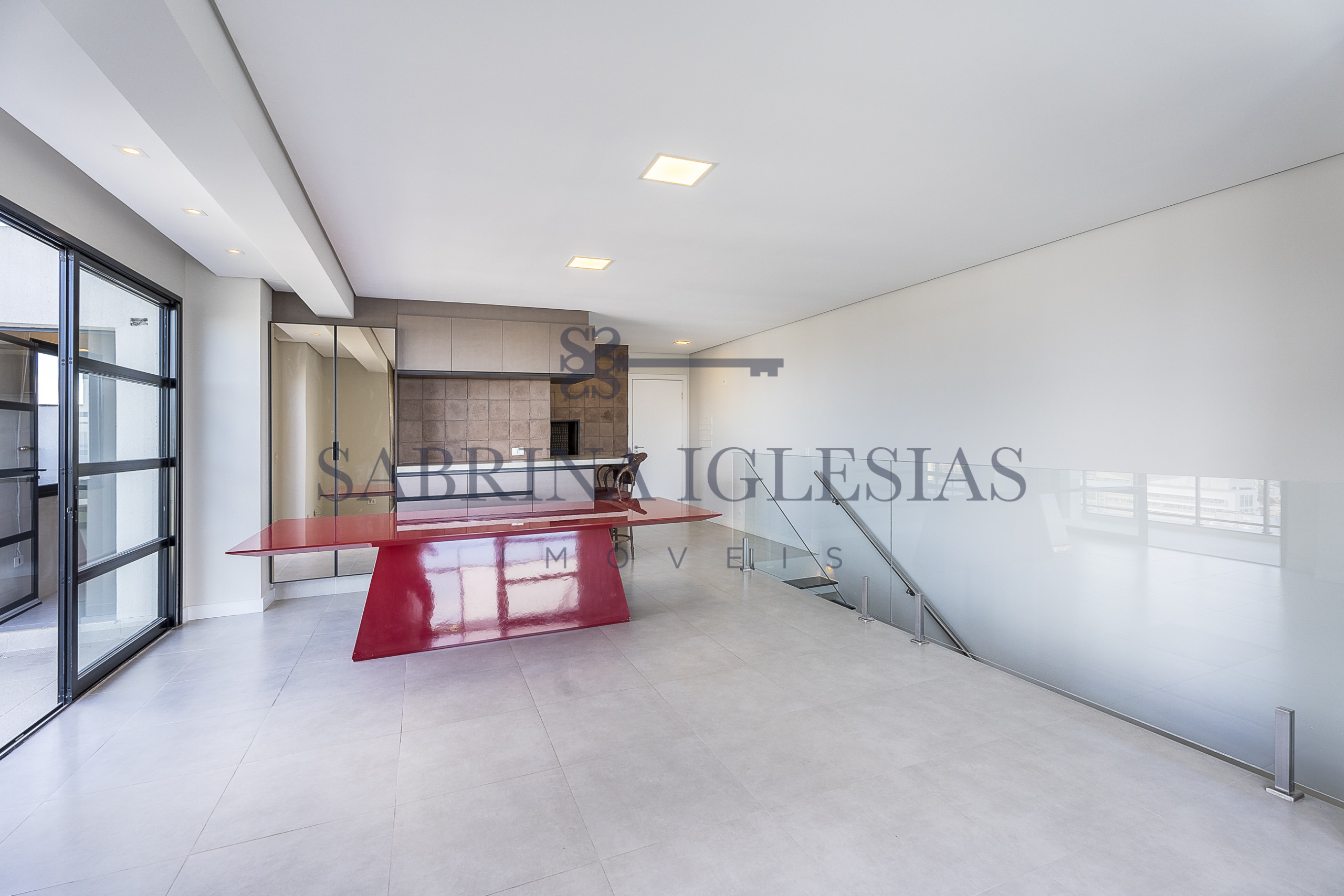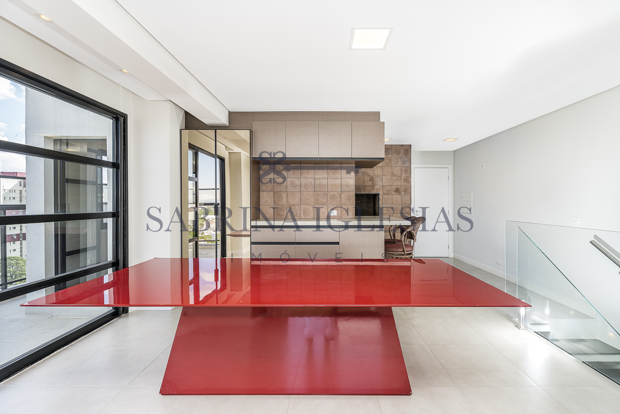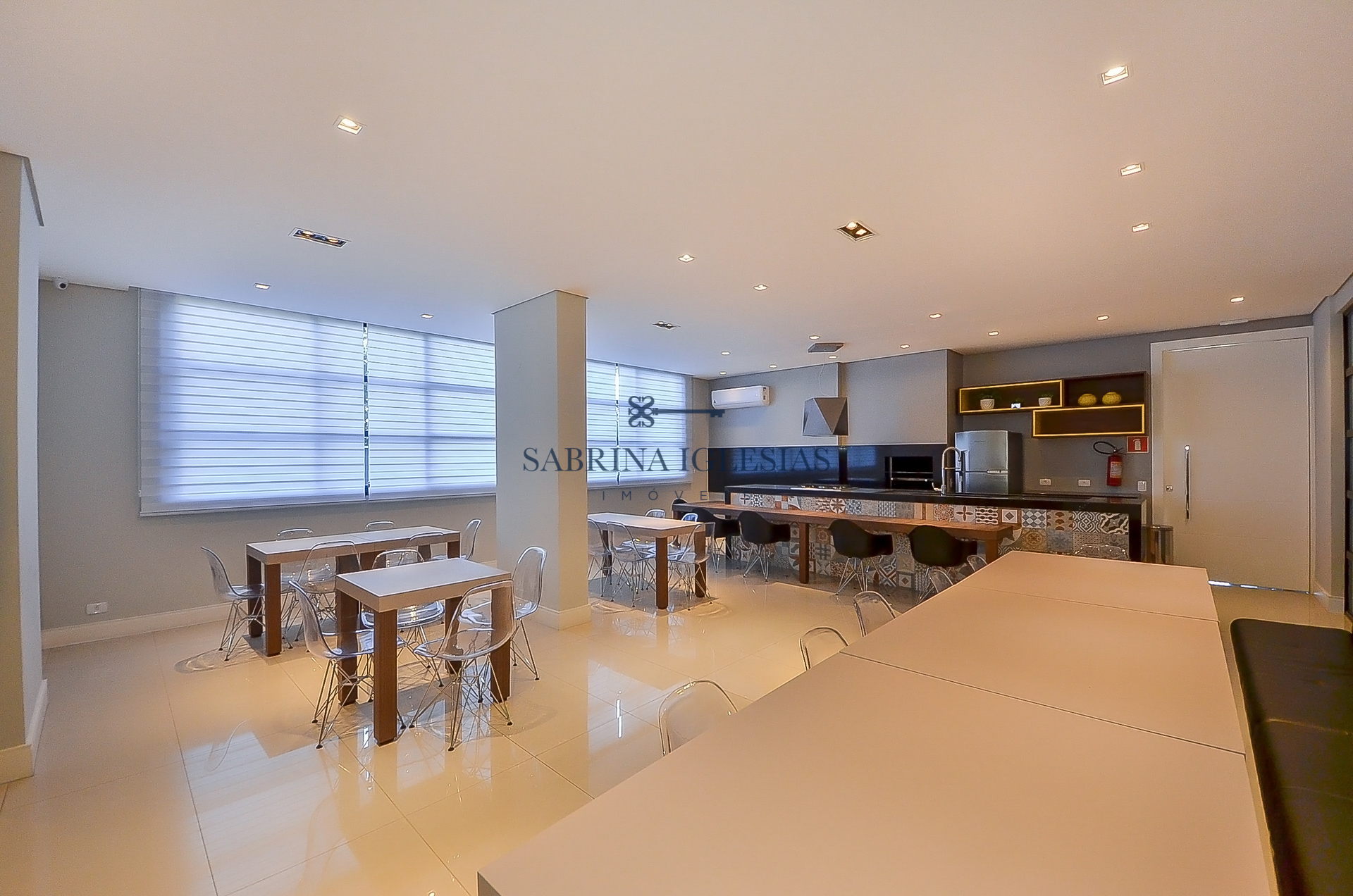 Moderna, ambiente social integrando estar com lareira, cozinha com churrasqueira.