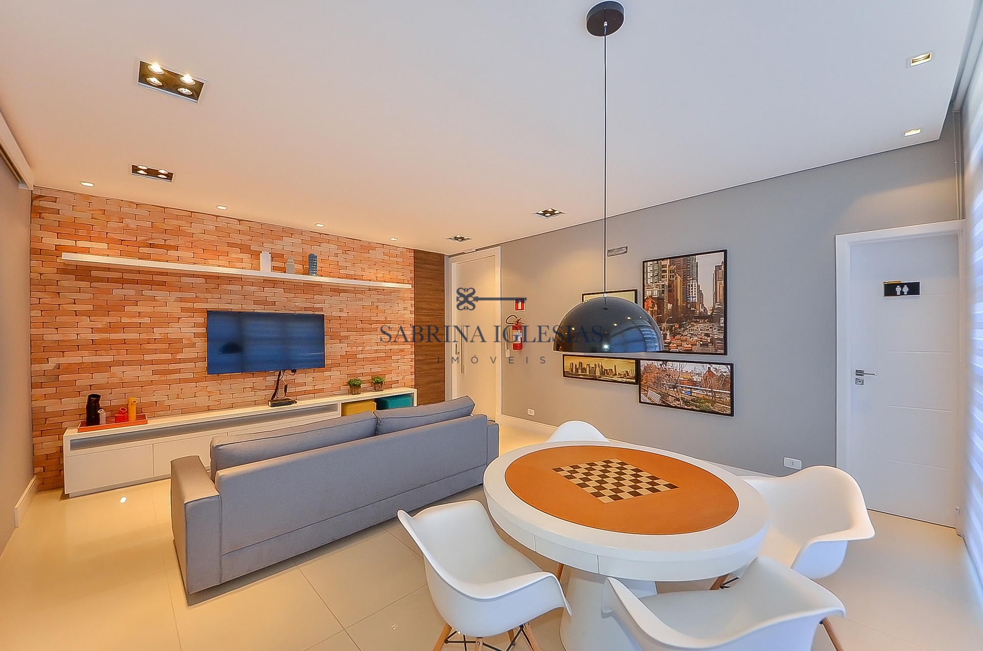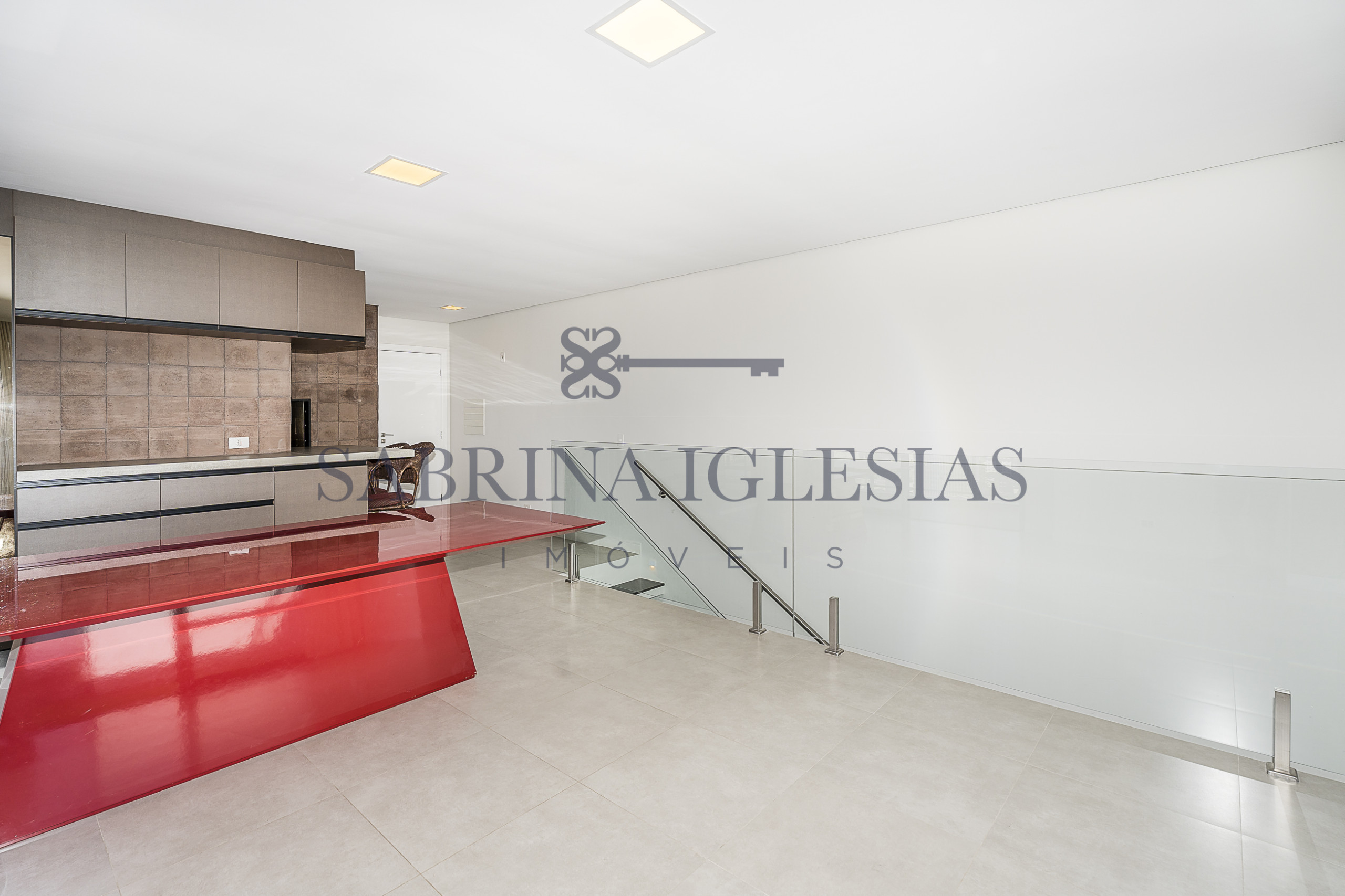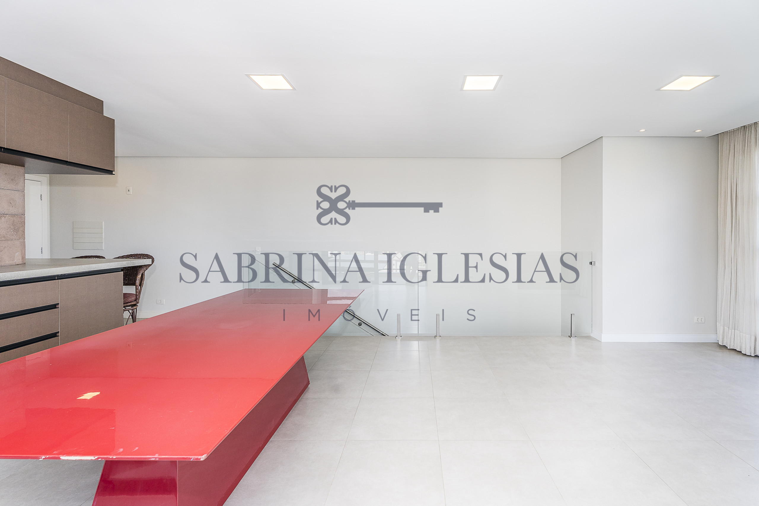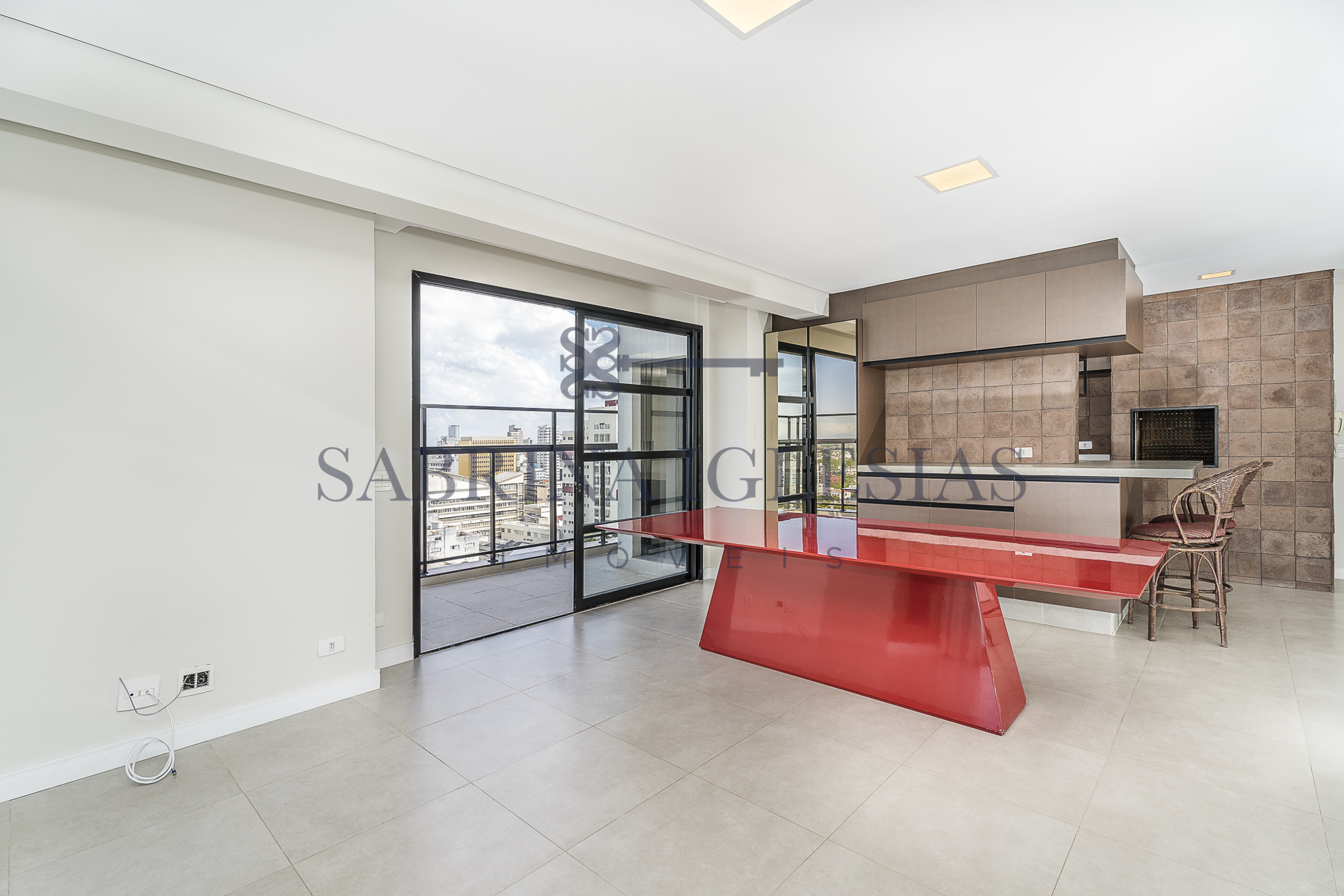 Moderna, ambiente social integrando estar com lareira, cozinha com churrasqueira.