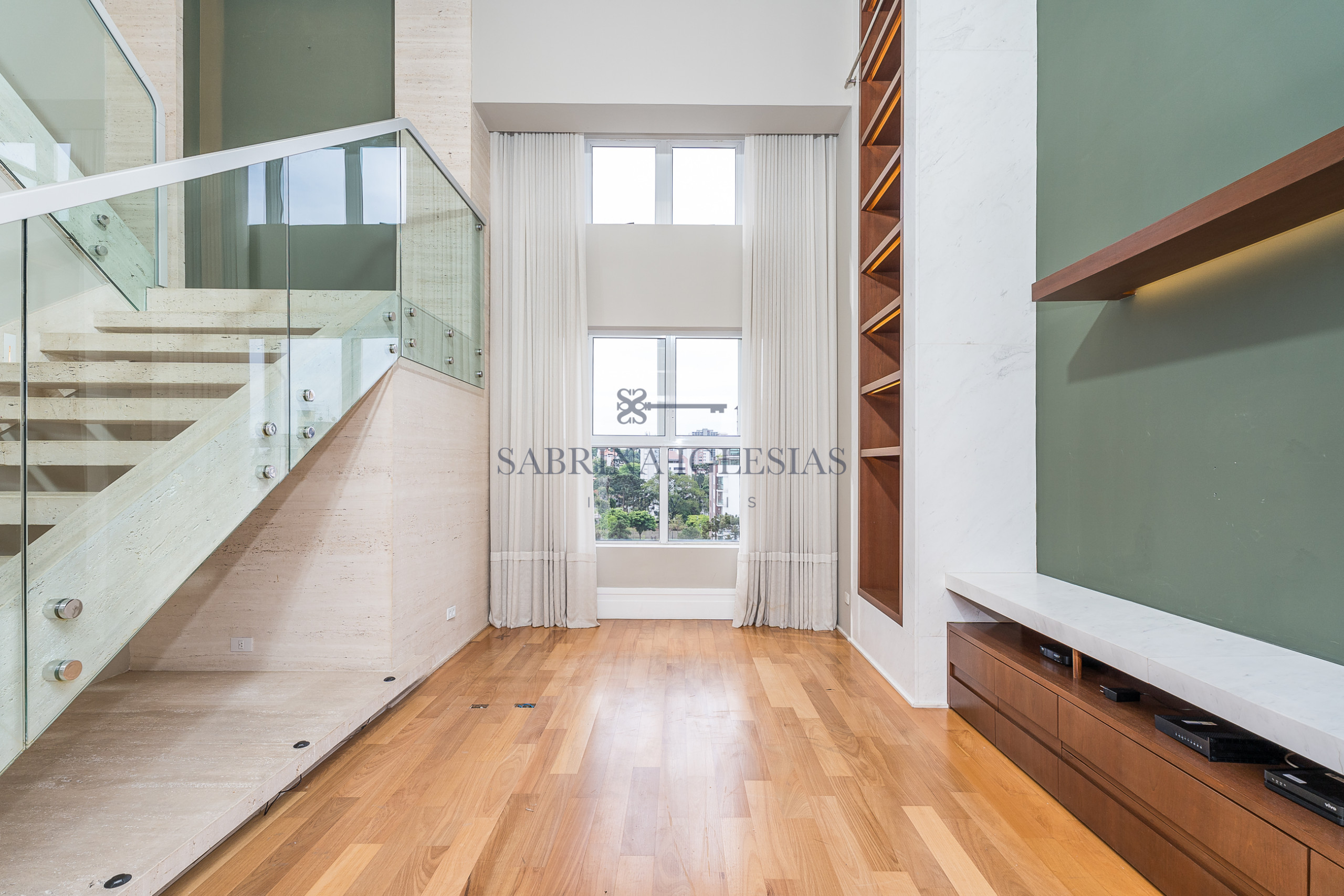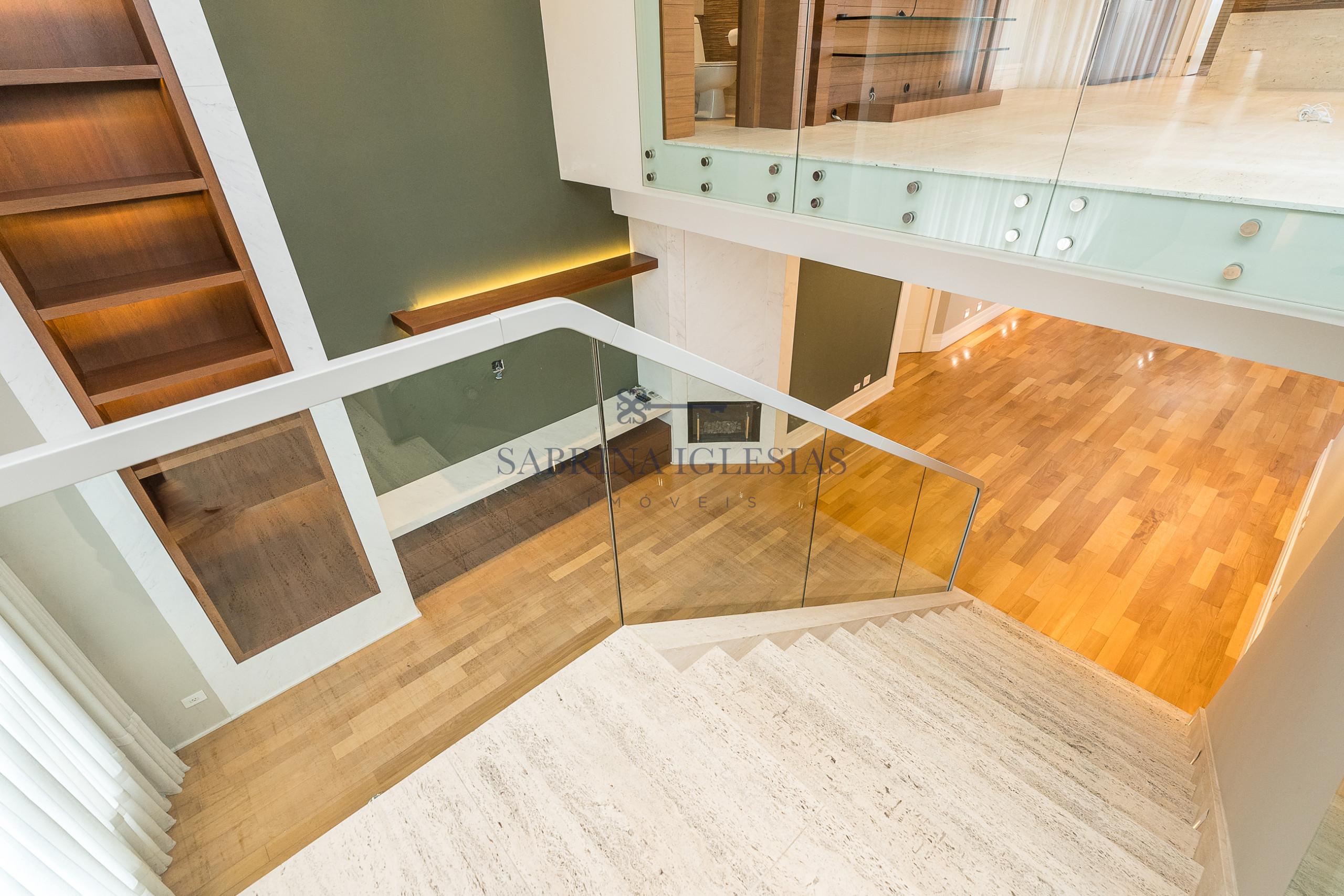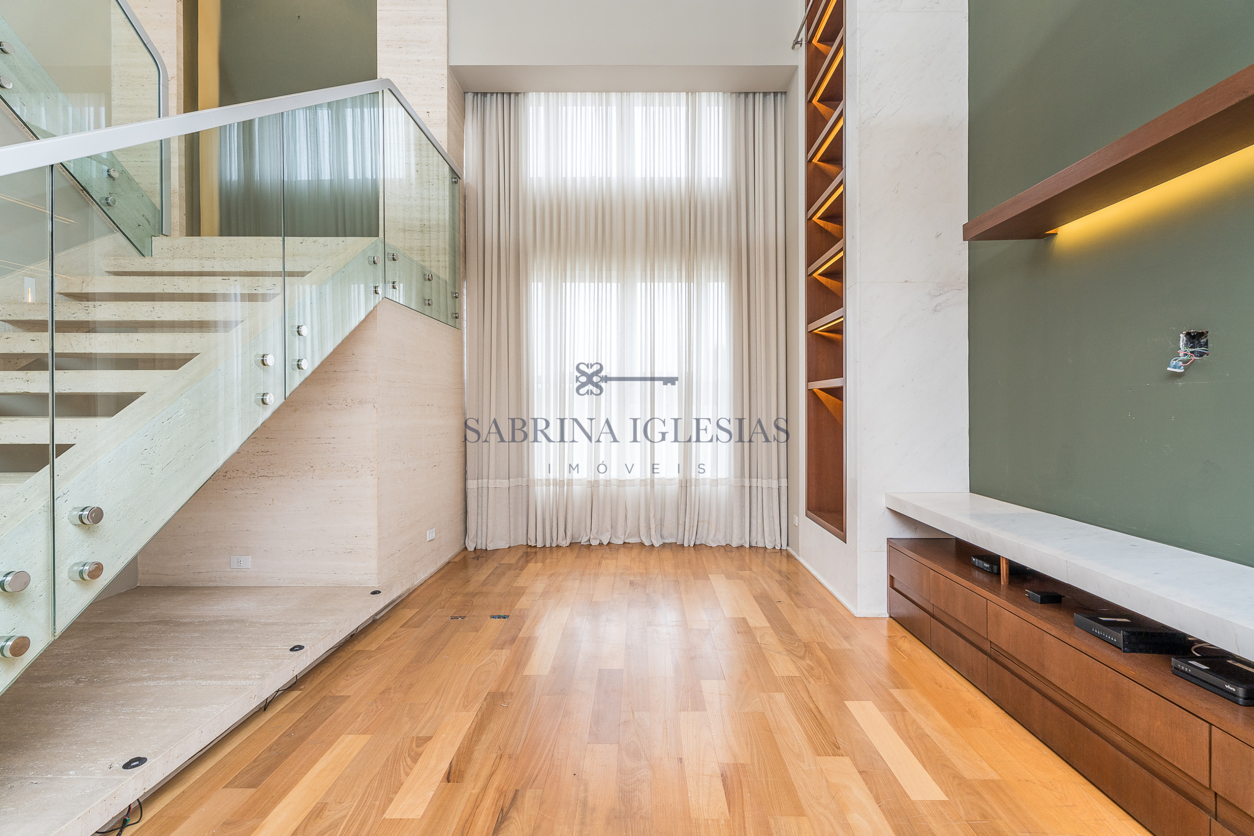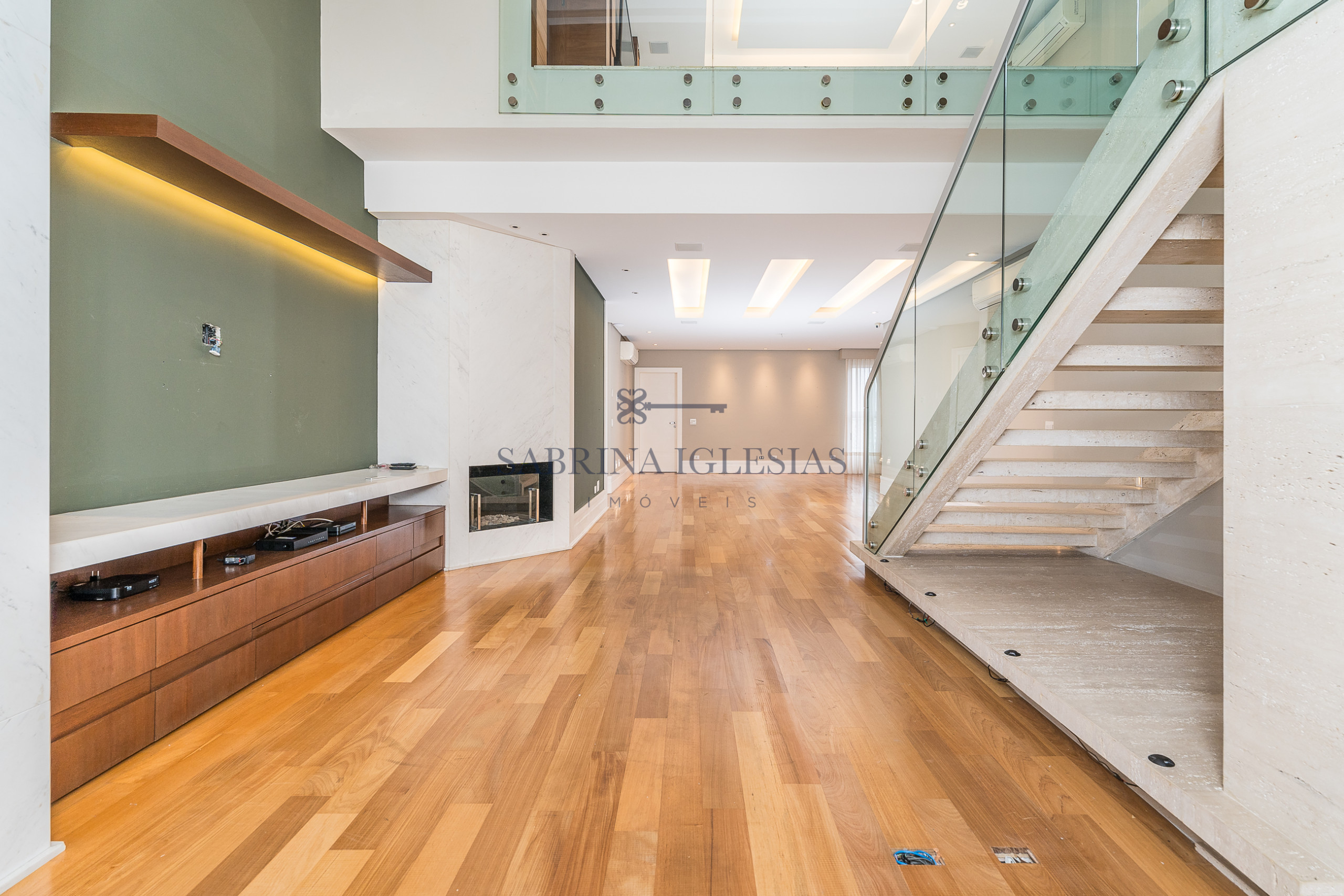 A sala com ótima iluminação natural em piso em madeira, um pé direito enorme com uma escala que leva para o segundo andar em mármore travertino, lareira e elevador nos dois andares da cobertura.