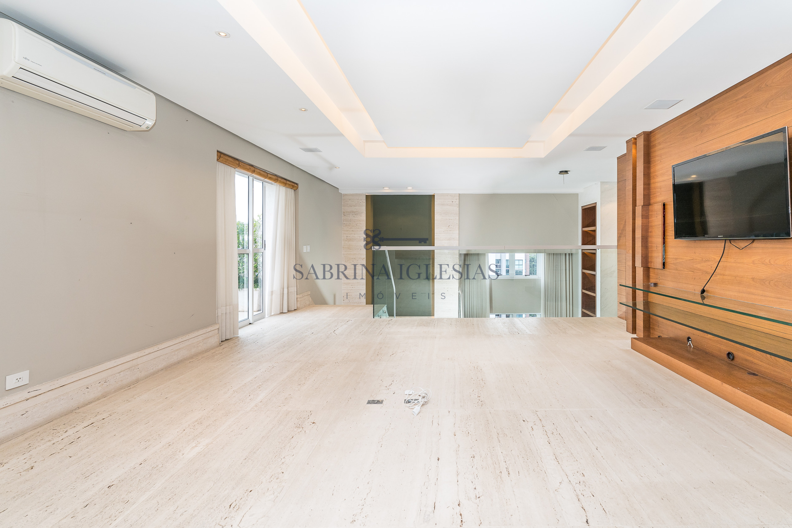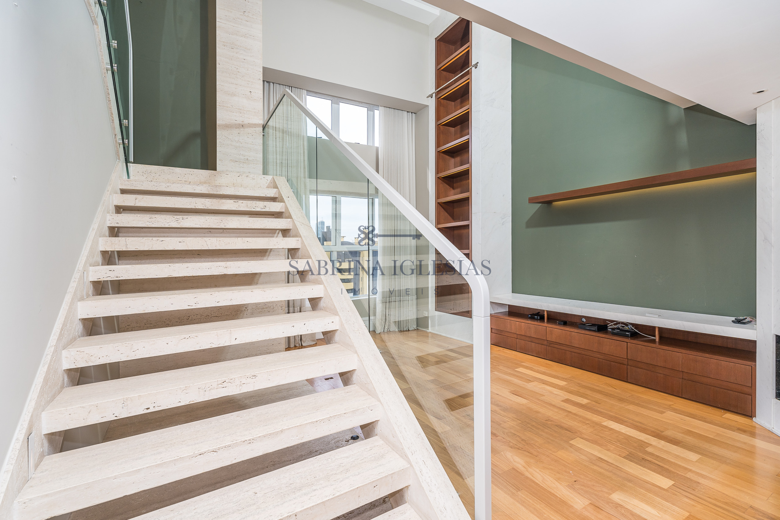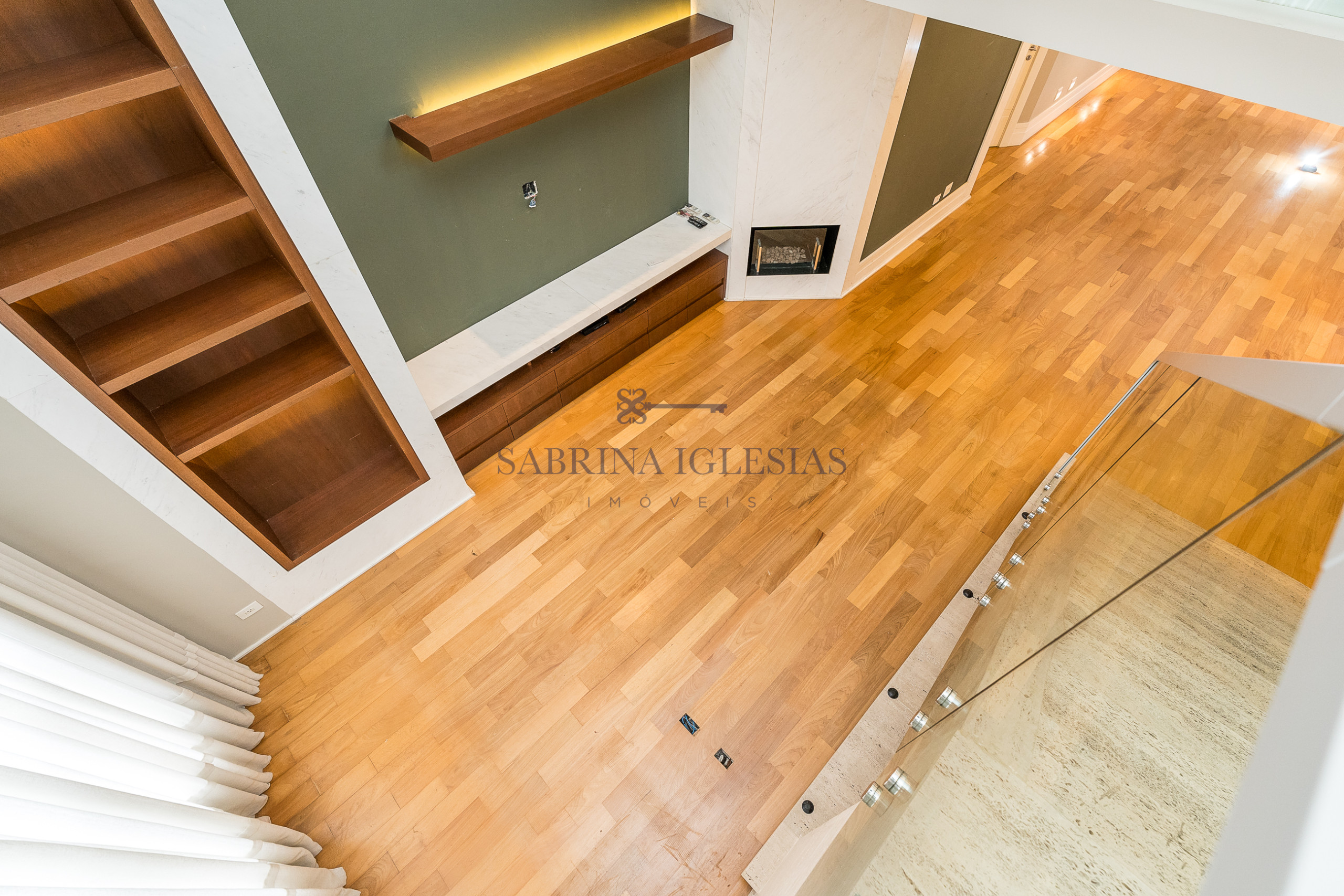 A sala com ótima iluminação natural em piso em madeira, um pé direito enorme com uma escala que leva para o segundo andar em mármore travertino, lareira e elevador nos dois andares da cobertura.