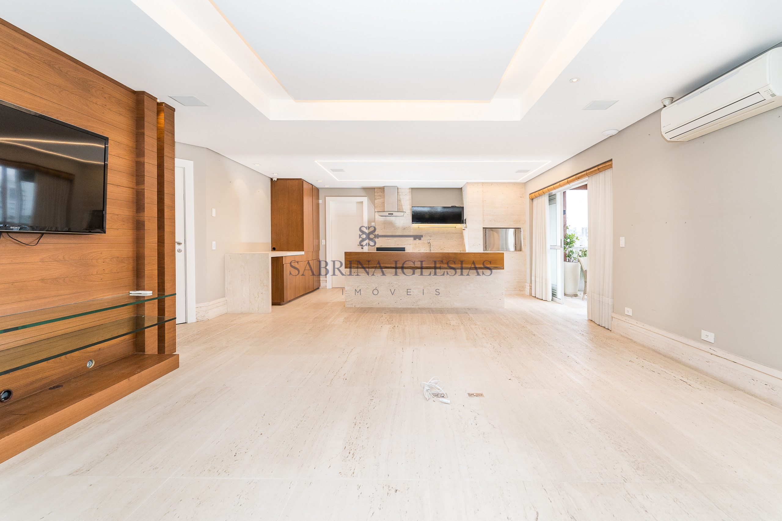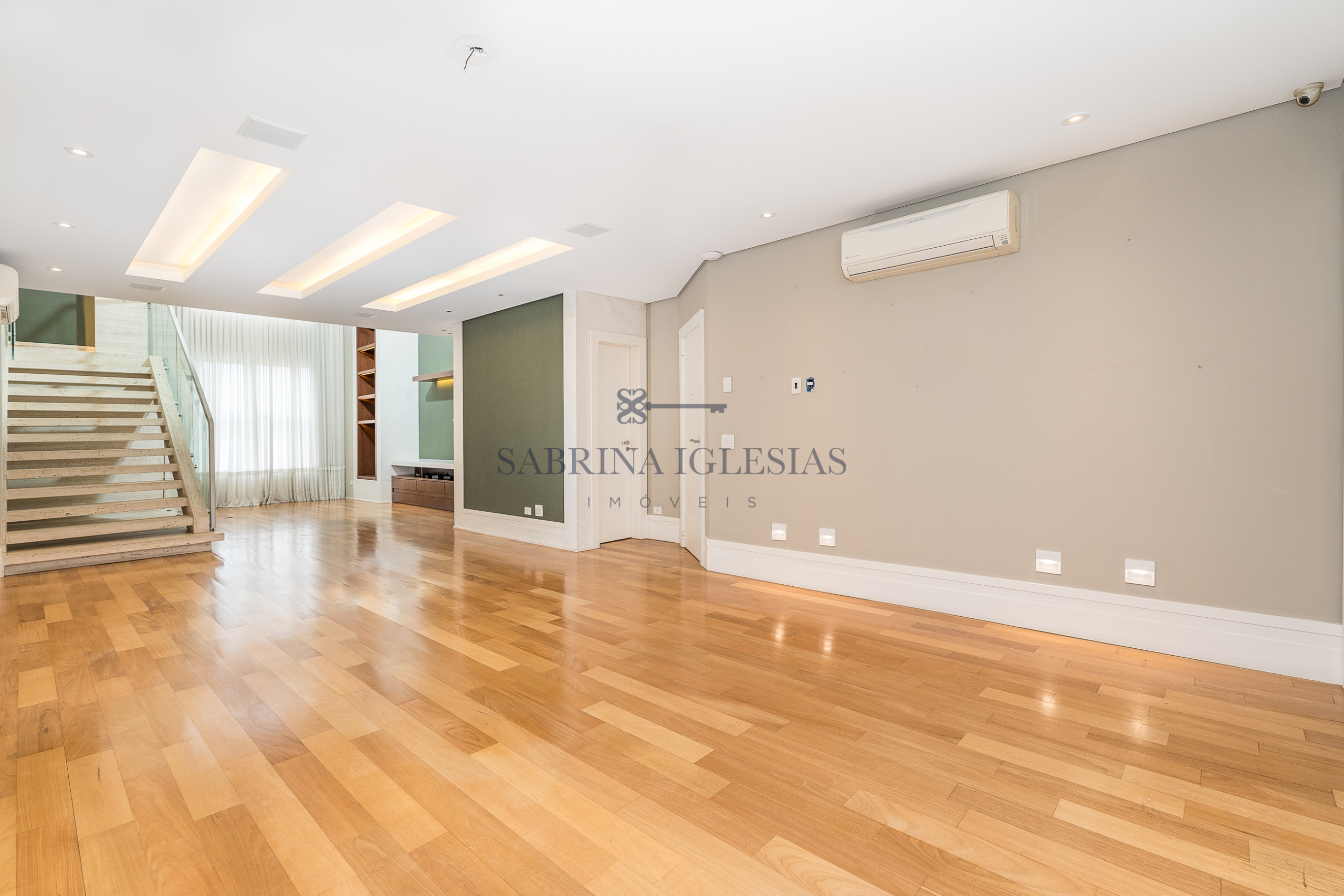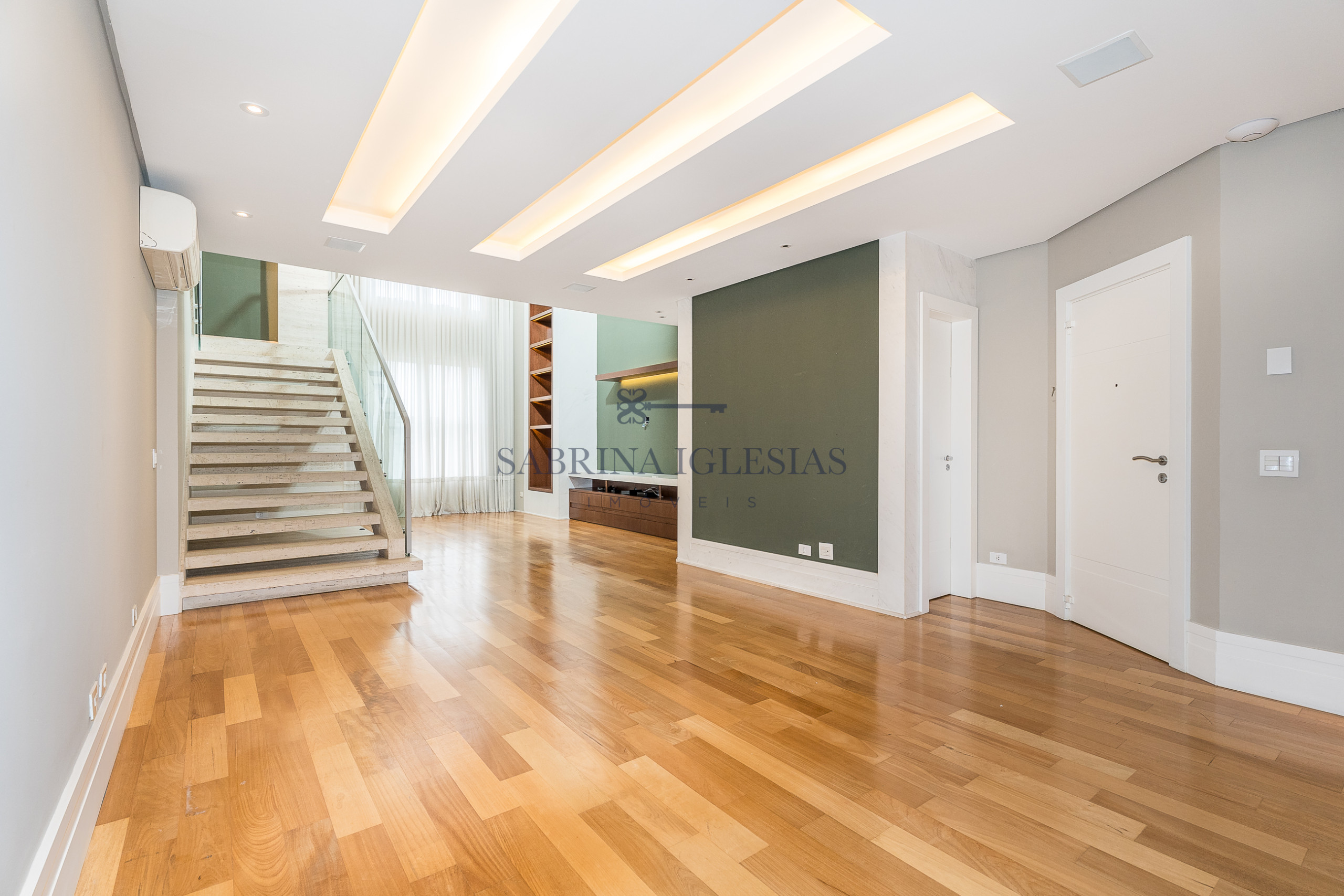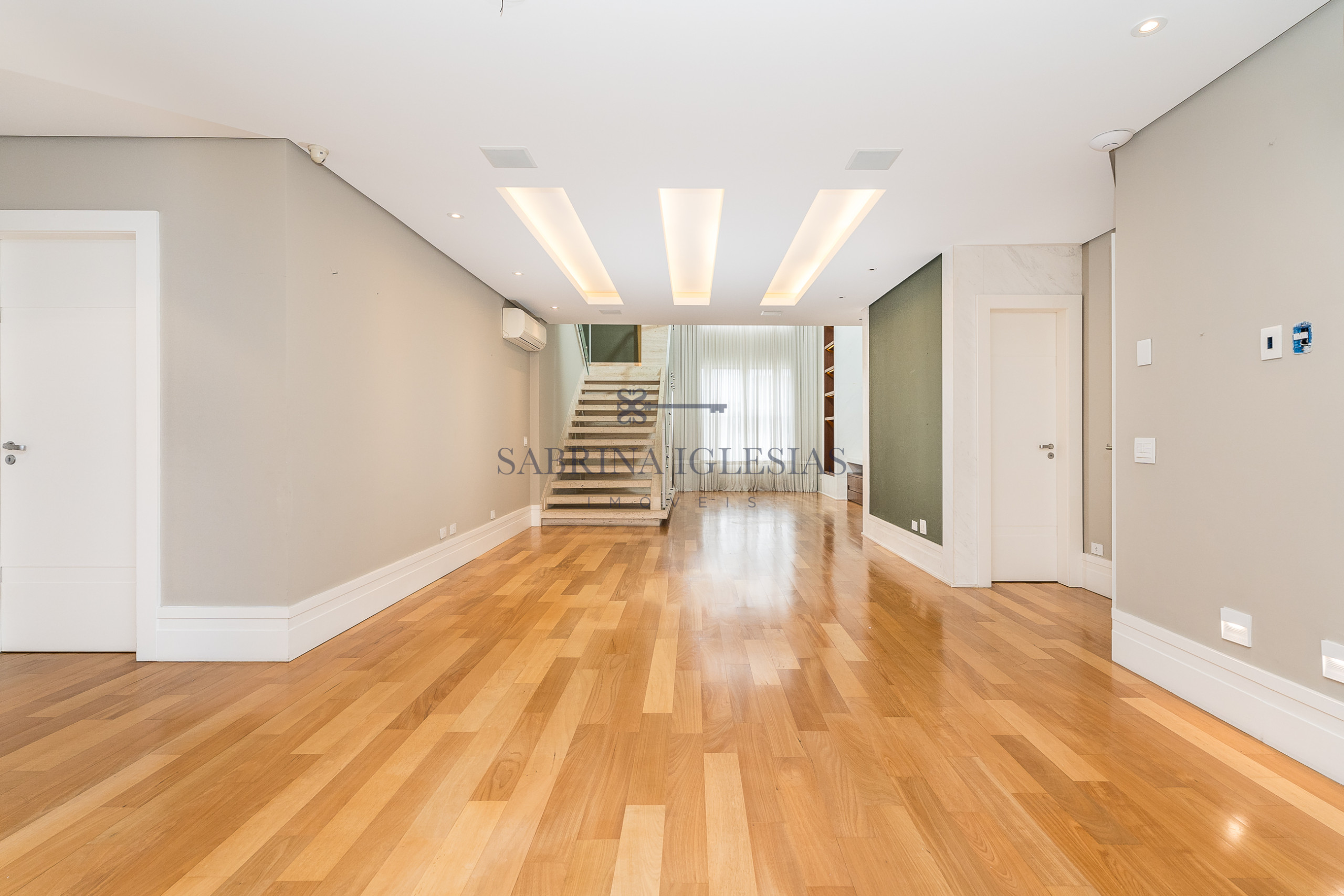 A sala com ótima iluminação natural em piso em madeira, um pé direito enorme com uma escala que leva para o segundo andar em mármore travertino, lareira e elevador nos dois andares da cobertura.