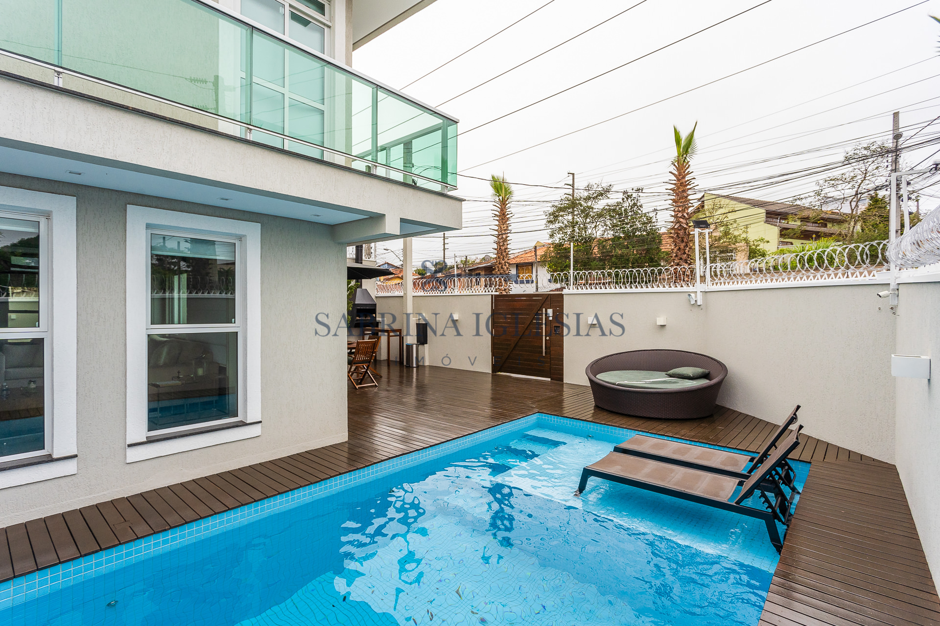 A área gourmet conta com um deck amplo em madeira e piscina com prainha e aquecimento elétrico.